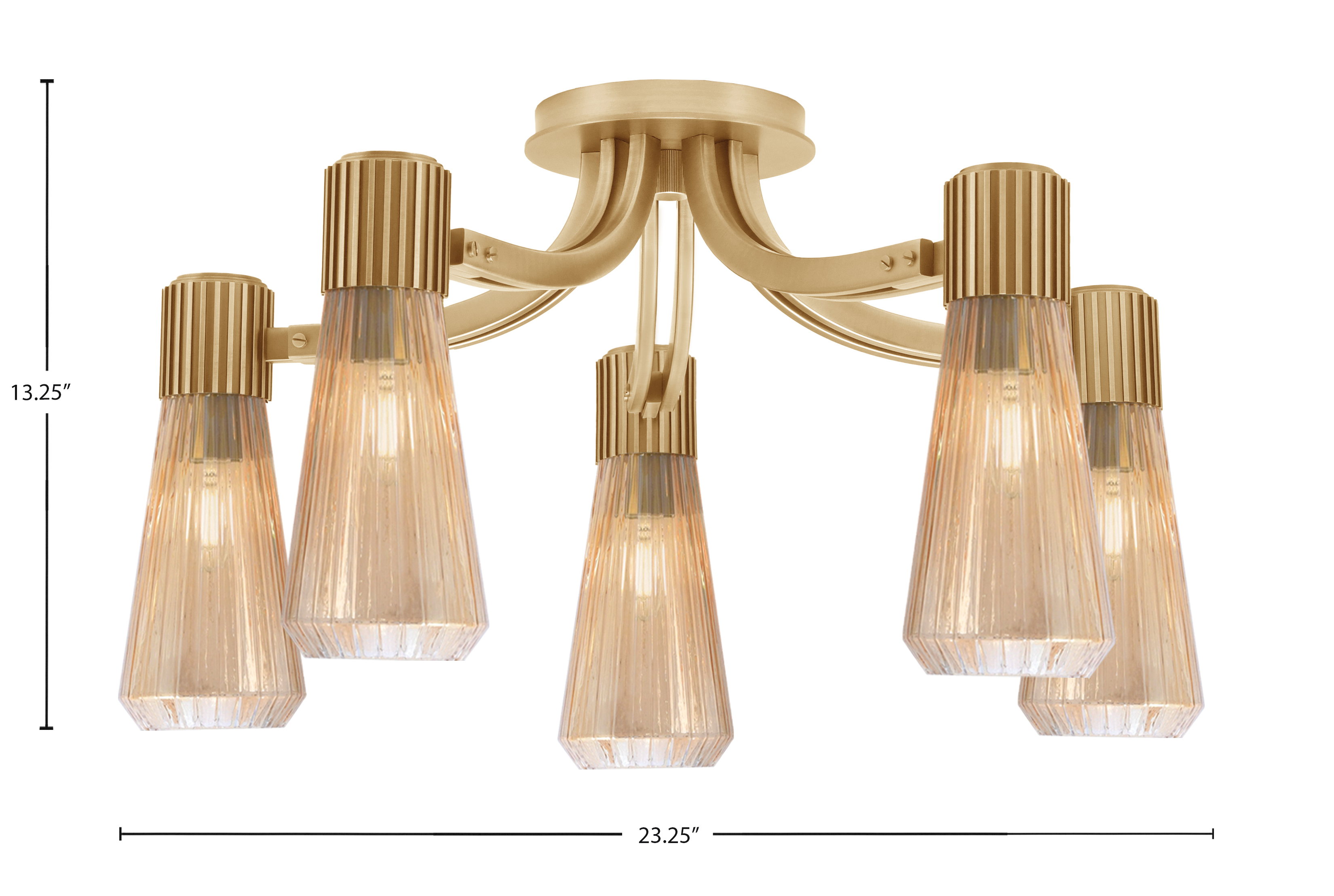 Toltec Lighting 4817-NAB-883 Everleigh 5 Light Semi-Flush, New Age Brass Finish, 4" Amber Ribbed GlassOut Of Stock Until January 30, 2026