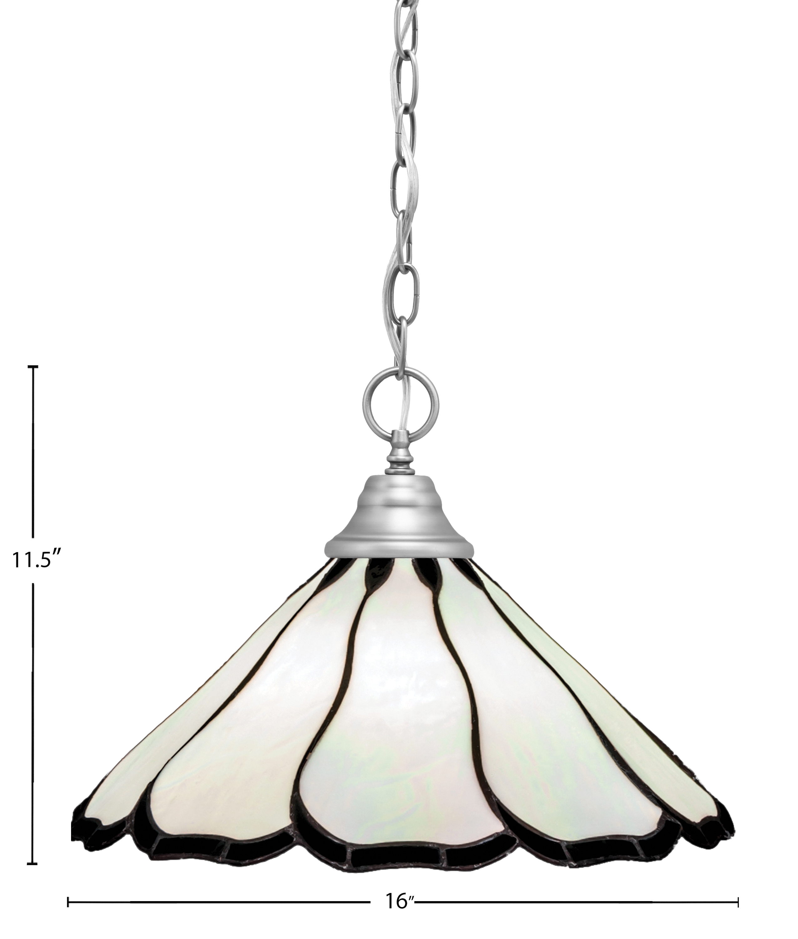 Elevate your interior with the sophisticated charm of this Chain Hung Pendant, featuring a sleek Brushed Nickel Finish paired with the exquisite 16″ Pearl & Black Flair Art Glass. The 16″ Pearl & Black Flair Art Glass shade is the focal point, showcasing luxurious intricate patterns. This artistic glass adds a dramatic and elegant touch, creating a captivating visual effect and a warm, ambient glow.