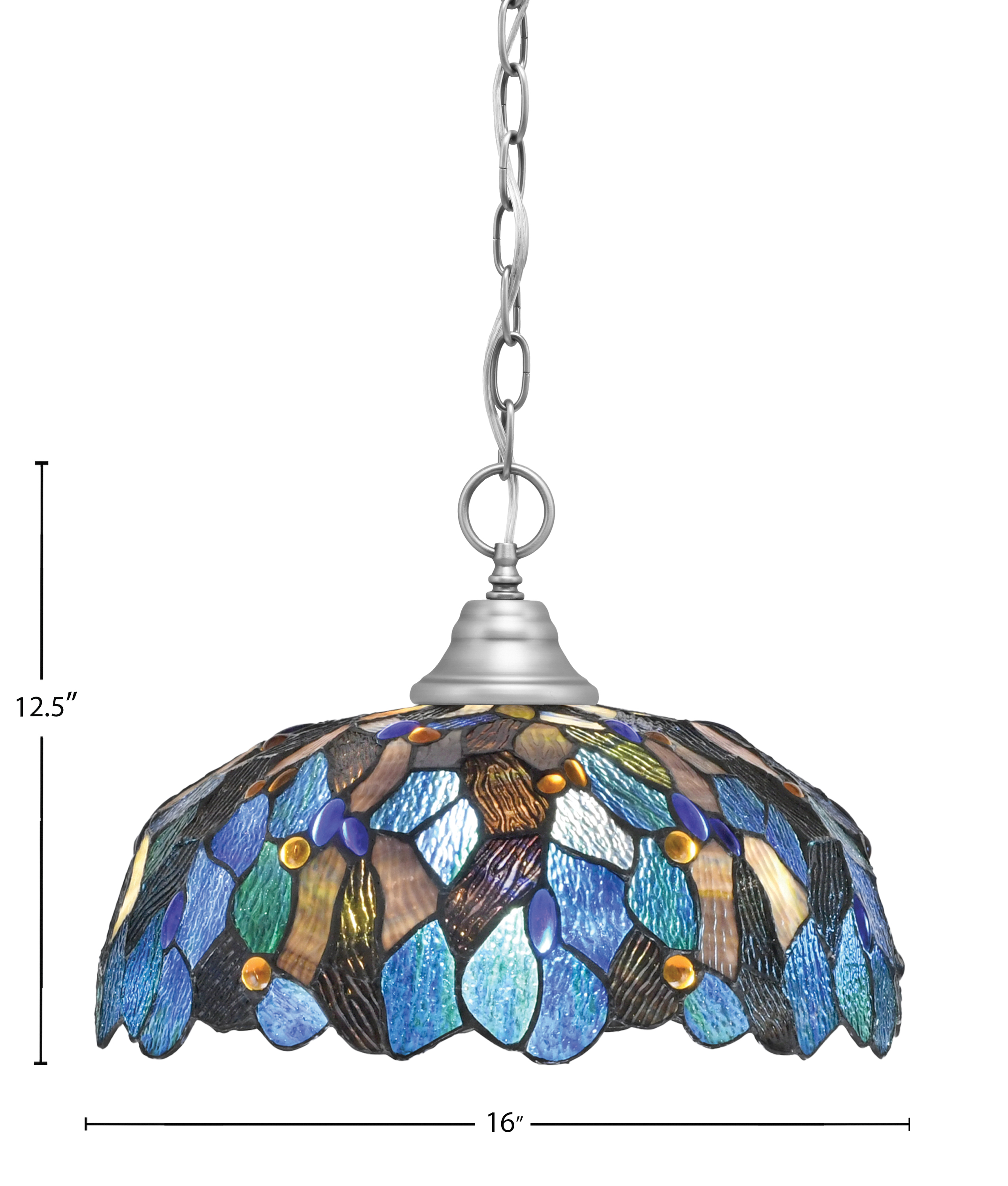 Illuminate your space with vibrant charm using this Chain Hung Pendant, featuring a sleek Brushed Nickel Finish paired with the striking 16″ Blue Mosaic Art Glass. The Brushed Nickel Finish offers a modern, polished contrast to the Blue Mosaic glass, emphasizing the pendant’s contemporary design while adding a sleek and stylish touch. Ideal for dining areas, living rooms, or entryways.