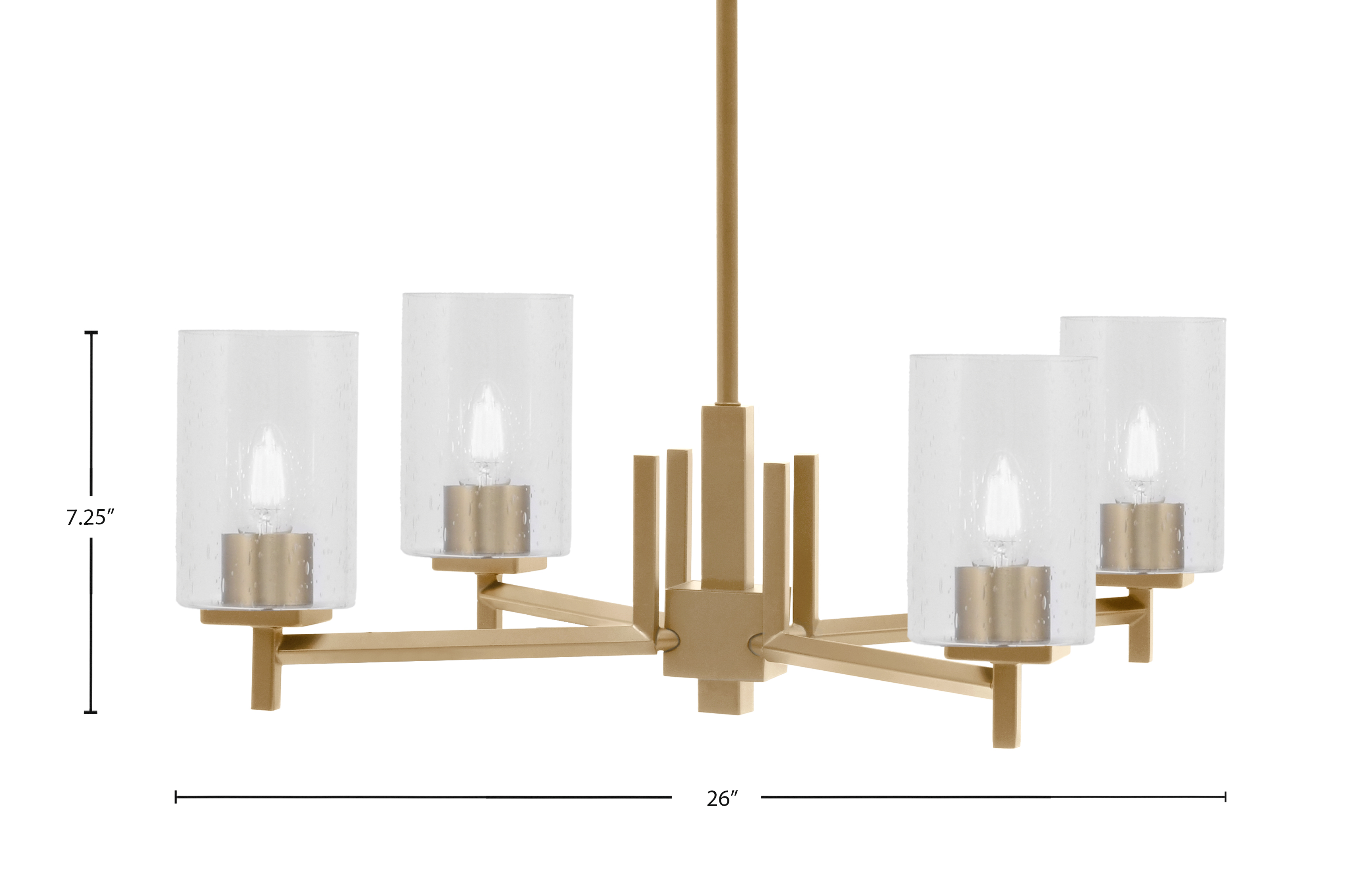Introduce contemporary elegance into your home with the Franklin 4 Light Chandelier. Crafted with a sleek New Age Brass finish, this chandelier combines modern sophistication with industrial charm. The 4-inch clear bubble glass shades create a soft, diffused light, casting a warm and inviting glow that enhances the mood of any room.