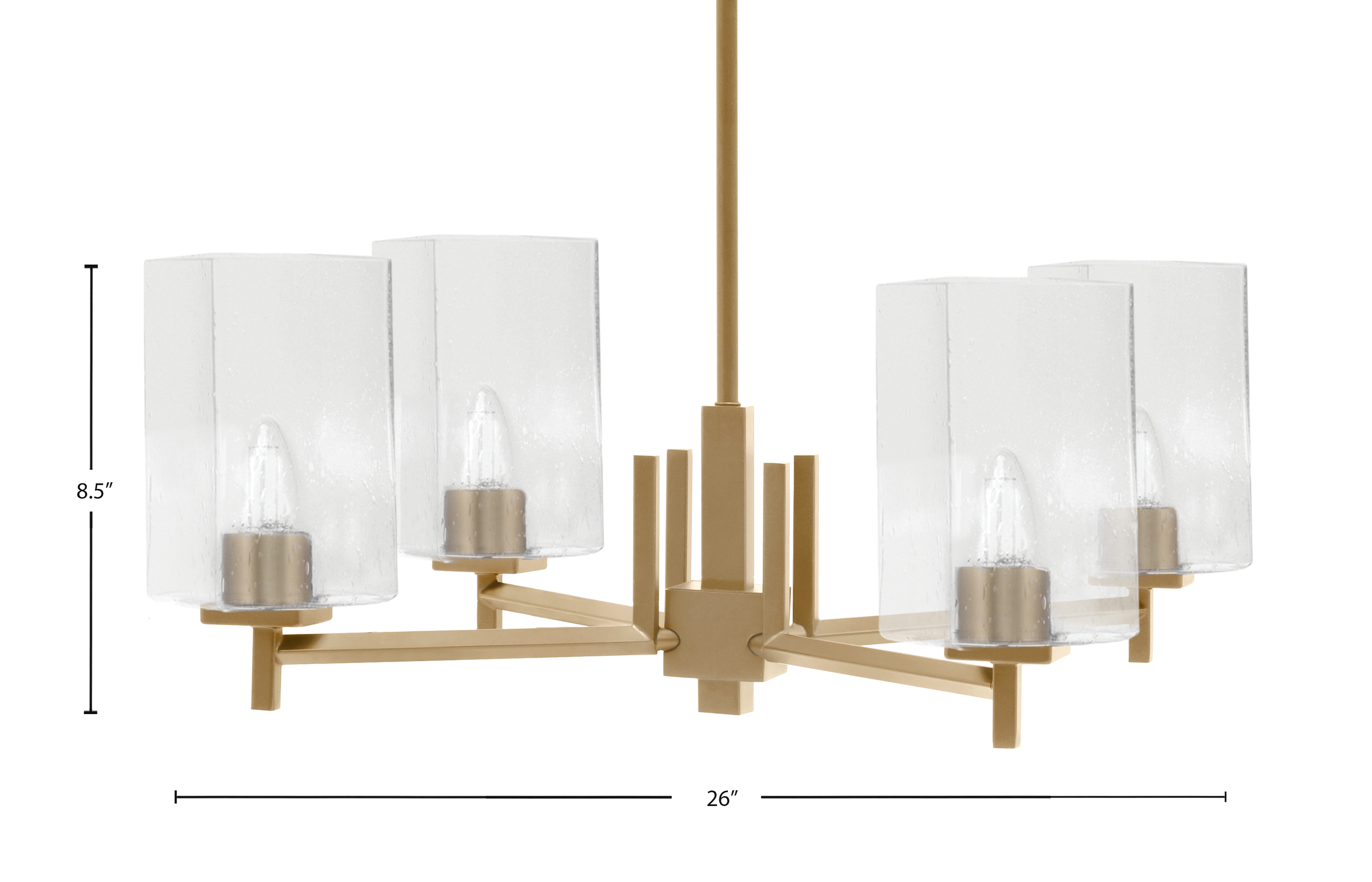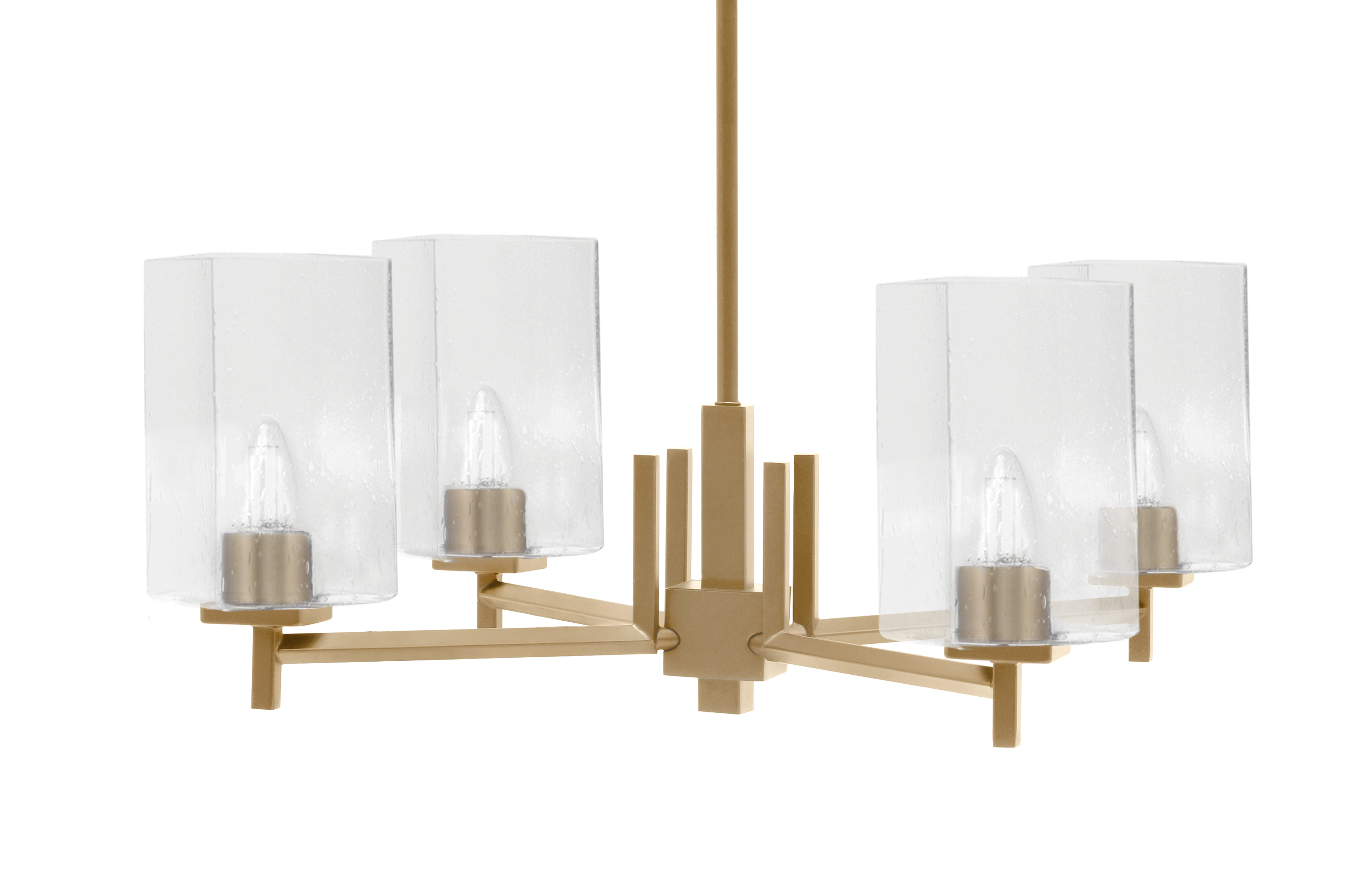 Bring contemporary sophistication to your home with the Franklin 4 Light Chandelier. The New Age Brass finish brings a touch of warmth and sophistication, while the 4-inch square clear bubble glass shades add an unexpected geometric twist. The clean lines and bold glass design make the Franklin chandelier a statement piece in any room.