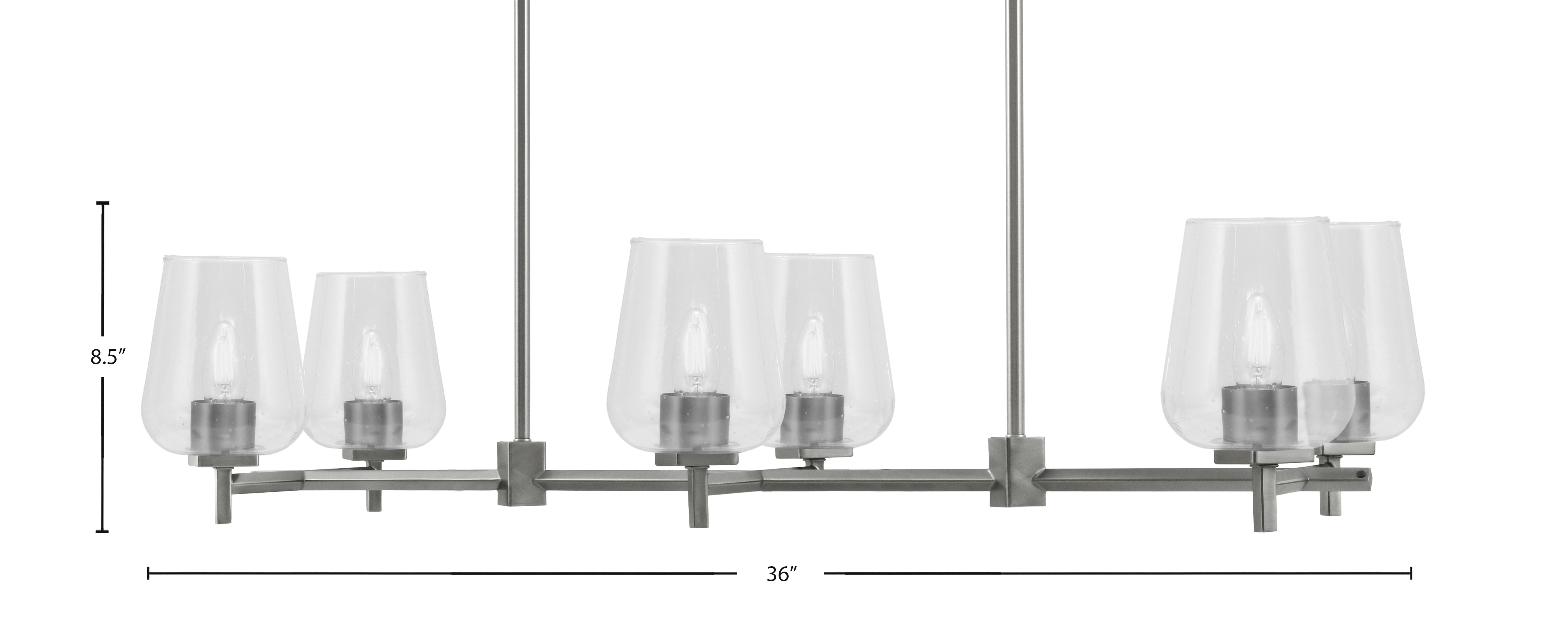 Sleek and sophisticated, the Franklin 6-Light Island Light makes a striking centerpiece above kitchen islands, dining tables, or workspaces. Finished in a cool Graphite tone, this fixture balances industrial edge with refined elegance. Six 5″ clear bubble glass shades offer a sparkling touch, delivering crisp, ambient light.