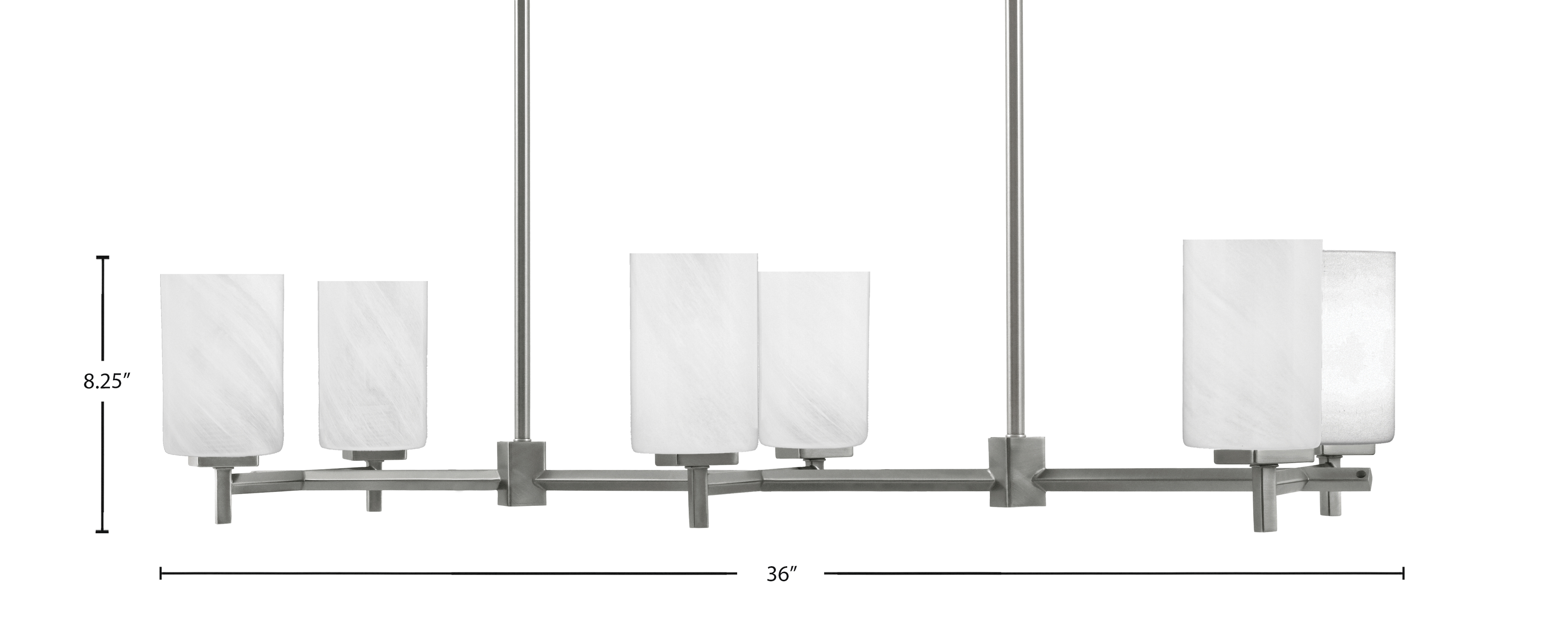 Clean lines and subtle sophistication define the Franklin 6-Light Island Light. Finished in a modern Graphite tone, this fixture is paired with six 4″ white marble glass shades that offer a soft, diffused glow and a touch of classic elegance. Ideal for contemporary kitchens, dining areas, or workspaces.