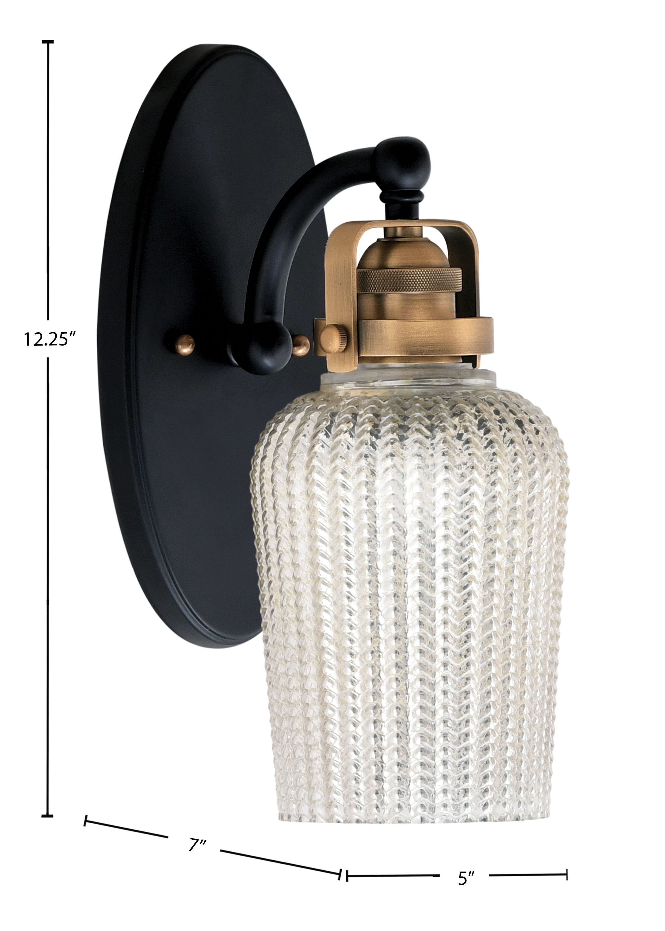 Introducing The Easton 1 Light Wall Sconce, Perfectly Showcased In A Matte Black And Brass Finish That Exudes Modern Elegance. The 5″ Silver Textured Glass Adds A Touch Of Contemporary Style, Creating A Stunning Visual Appeal For Any Space. Illuminate Your Home With This Elegant Fixture That Blends Quality Craftsmanship With Timeless Design.