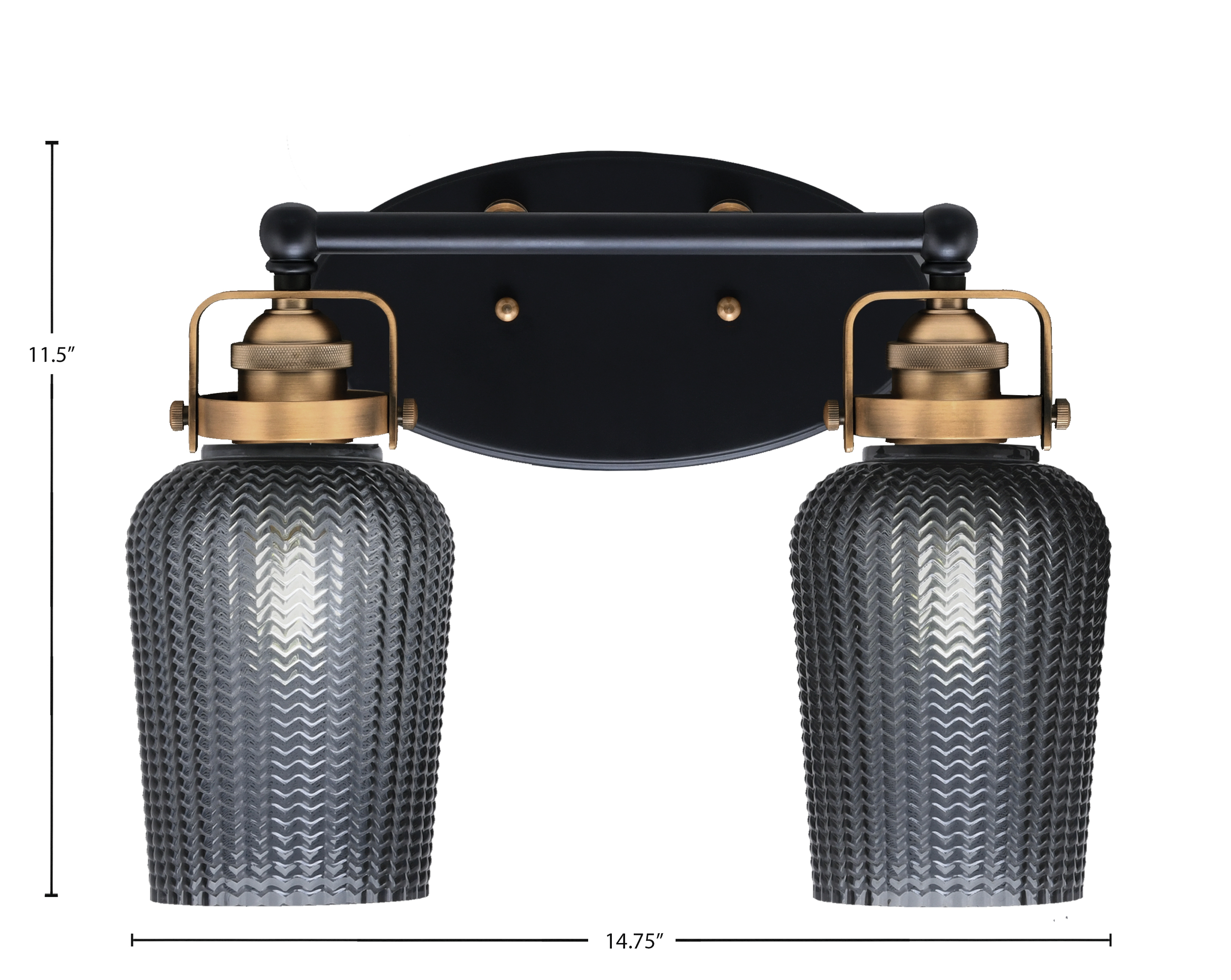 Introducing the Easton 2 Light Bath Bar, a Stunning Addition to Any Bathroom Decor. Featuring an Elegant Matte Black and Brass Finish, This Fixture Provides a Timeless Appeal. The 5″ Smoke Textured Glass Shades Create a Warm and Inviting Glow, Perfect for Enhancing Your Space.