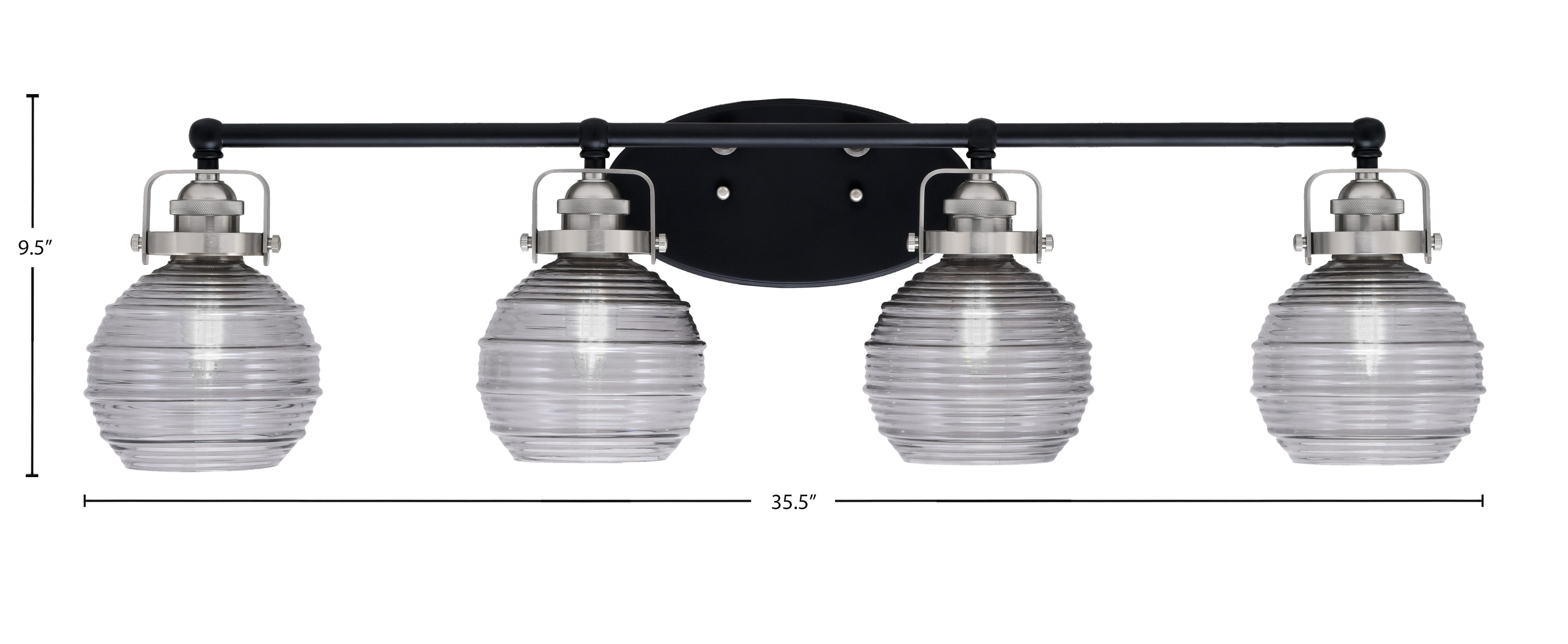 Introducing the Easton 4 Light Bath Bar, a Stunning Addition to Any Bathroom Decor. Featuring a Sleek Matte Black and Brushed Nickel Finish, This Fixture Harmonizes Modern Elegance with Industrial Charm. The 6″ Smoke Ribbed Glass Shades Create a Warm, Inviting Ambiance While Providing Bright, Functional Lighting for Your Space.