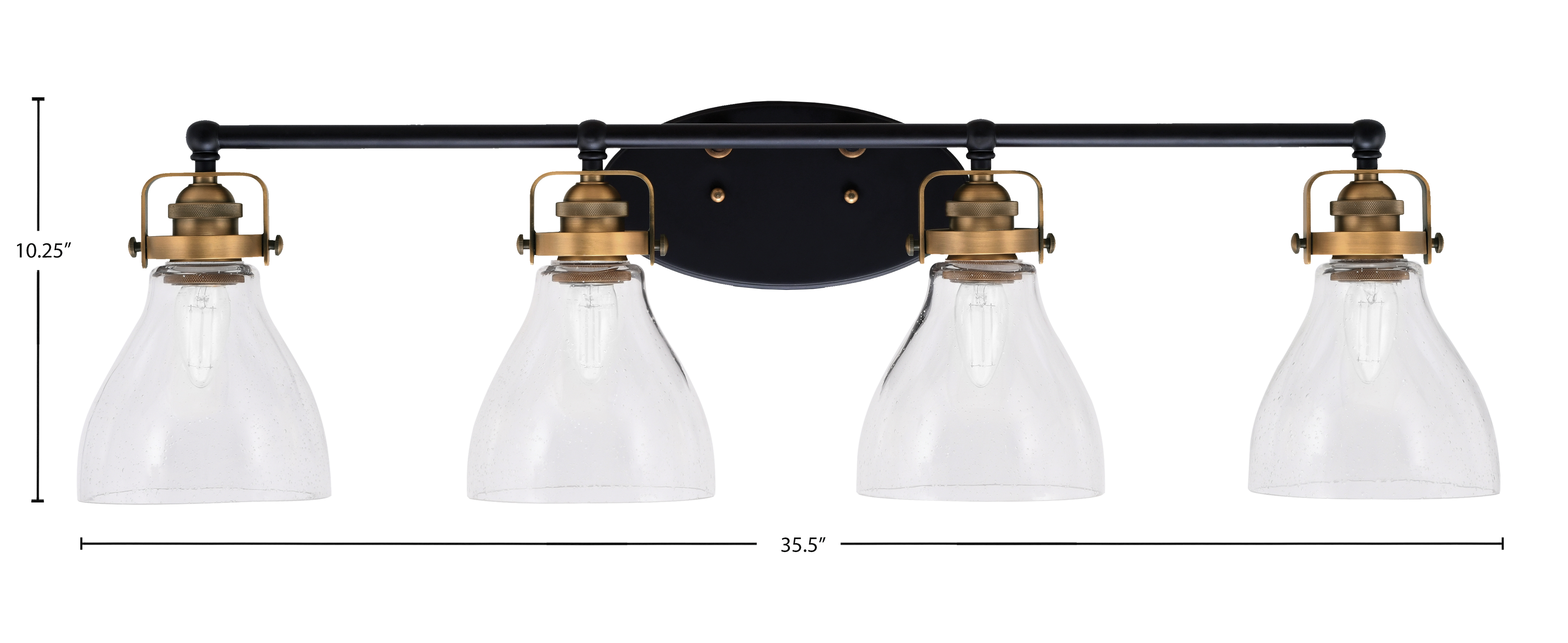 Introducing The Easton 4 Light Bath Bar, A Stunning Addition To Your Bathroom. Finished In A Chic Matte Black And Elegant Brass, This Light Fixture Combines Style With Functionality. The 6.25″ Clear Bubble Glass Accents Provide A Beautiful Diffusion Of Light, Creating A Warm And Inviting Atmosphere.