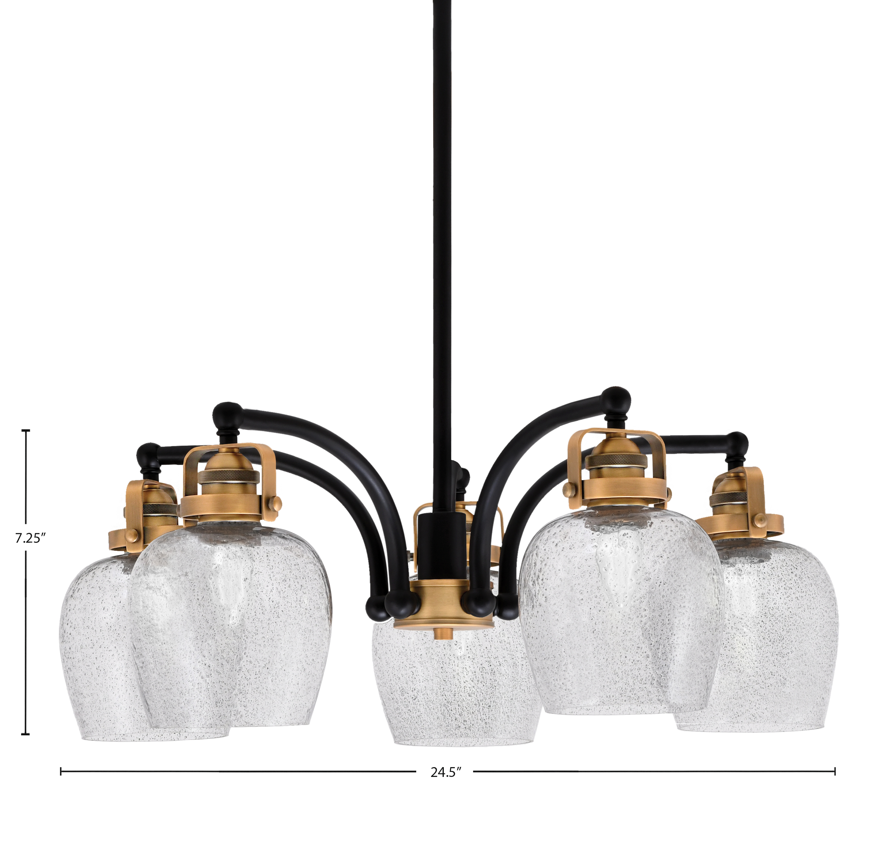 Introducing the Easton 5 Light, Downlight, Chandelier, a Striking Addition to Any Living Space. This Beautiful Fixture Features a Modern Matte Black & Brass Finish, Perfectly Complementing Its Elegant Design. The 6″ Smoke Bubble Glass Shades Create a Warm, Inviting Glow, Enhancing the Ambiance of Your Home.