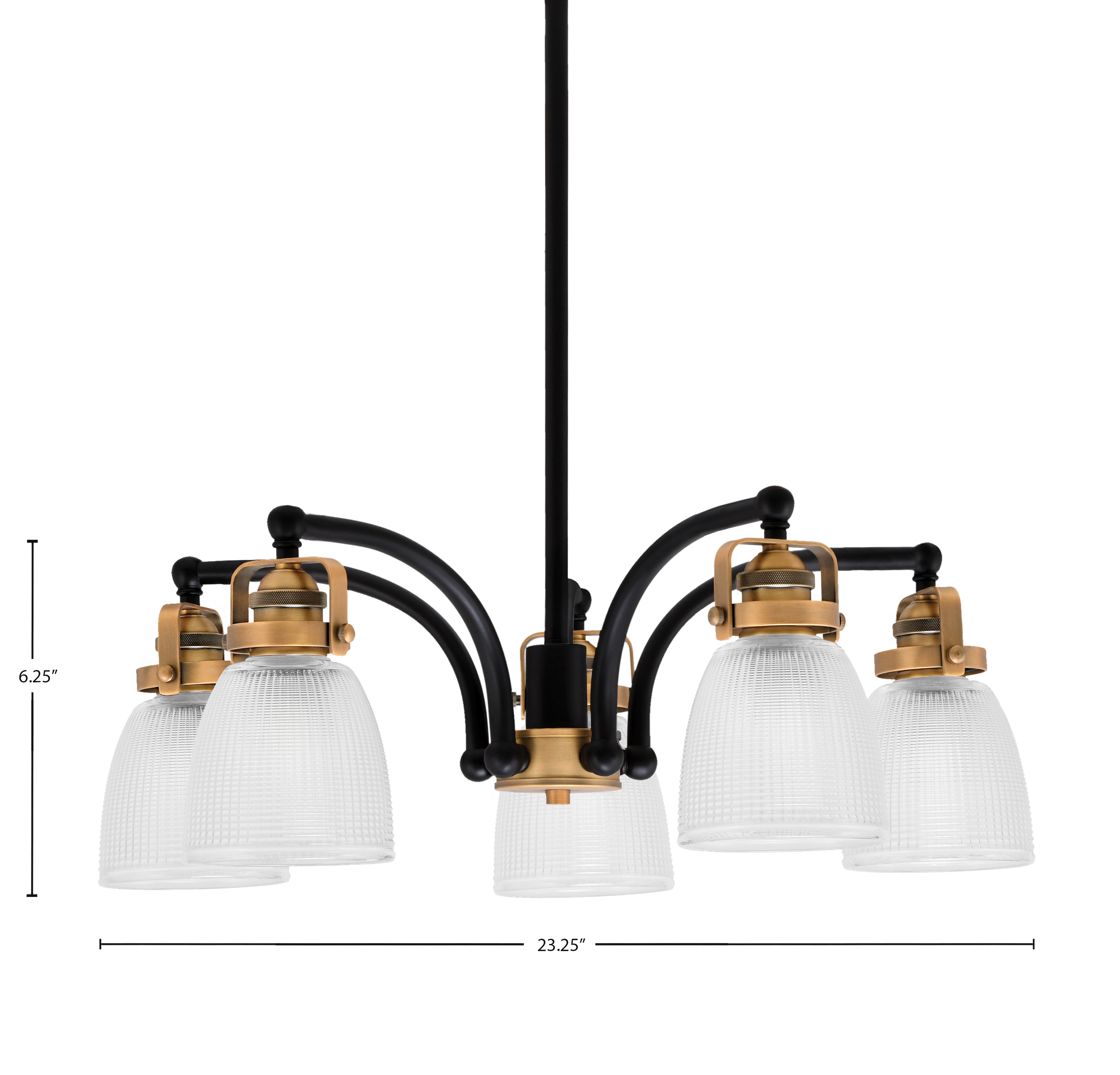 Introducing The Easton 5 Light, Downlight, Chandelier, An Exquisite Addition To Any Space. Featuring A Stylish Matte Black And Brass Finish, This Chandelier Elevates Your Decor While Providing Bright, Warm Illumination. The 5″ Clear Ribbed Glass Shades Add A Touch Of Elegance And Flair, Making It The Perfect Focal Point For Your Dining Room Or Living Area.