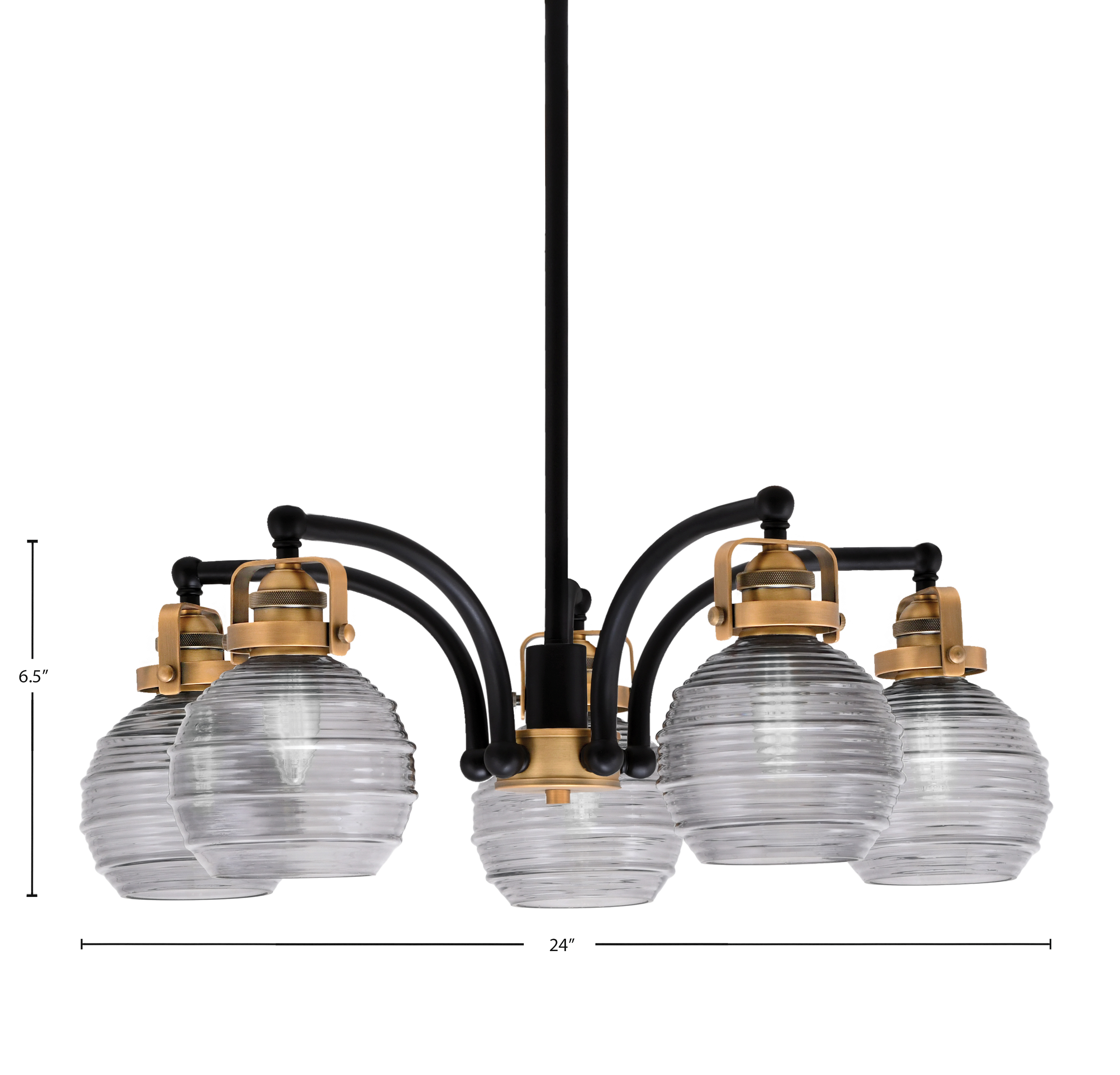 Illuminate Your Space With The Easton 5 Light, Downlight, Chandelier That Features A Beautiful Hang Straight Swivel. Showcased In A Striking Matte Black And Brass Finish, This Chandelier Exudes Elegance And Modern Style. Complemented By 6″ Smoke Ribbed Glass, It Creates A Warm And Inviting Ambiance Perfect For Any Room.