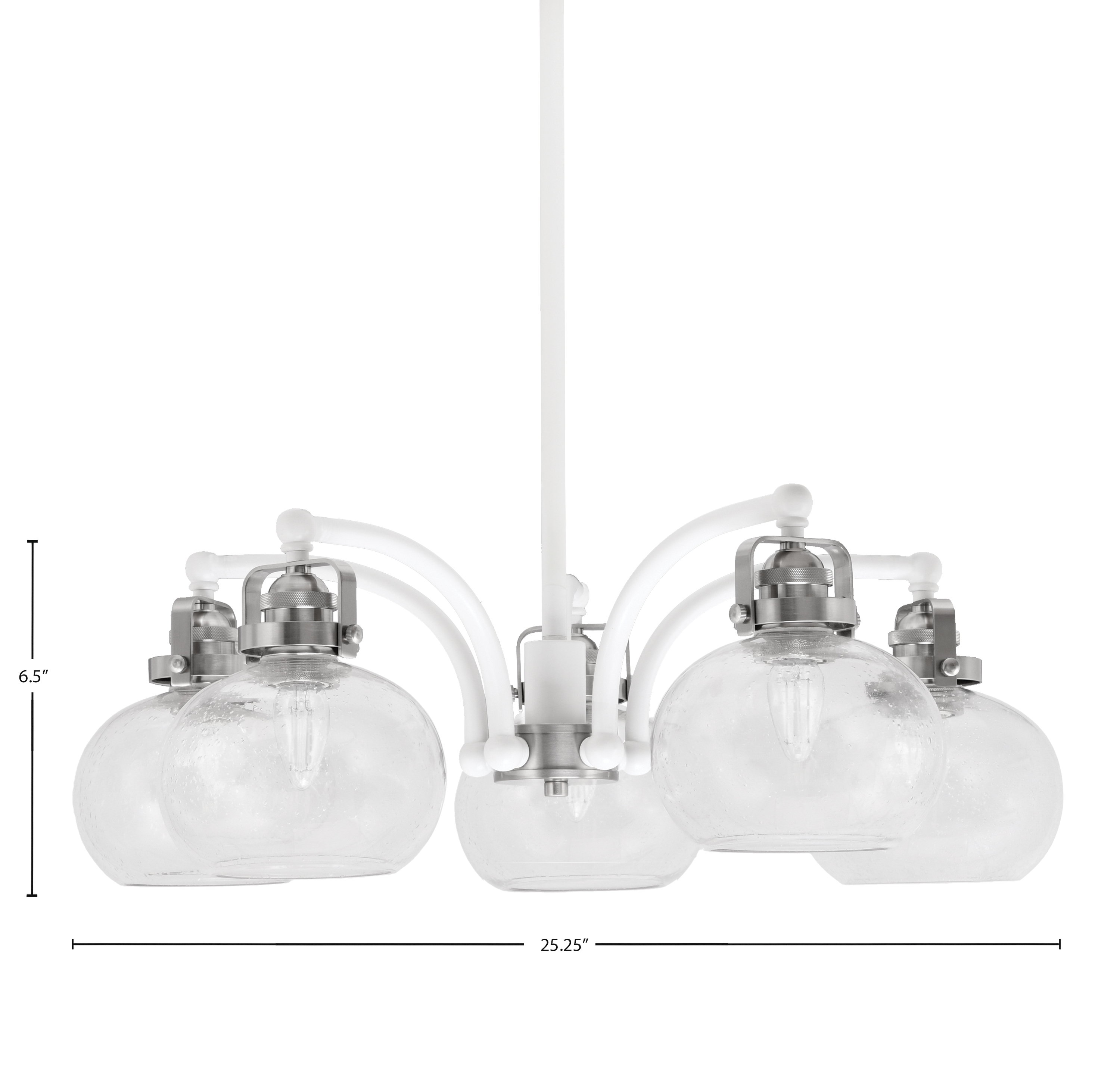 Introducing the Easton 5 Light, Downlight, Chandelier, a Stunning Addition To Your Home Decor. This Elegant Fixture Features a Unique Hang Straight Swivel, Providing Exceptional Versatility In Placement. Finished In a Striking Combination Of White And Brushed Nickel, It Showcases 7″ Clear Bubble Glass Shades That Create a Beautiful, Diffused Glow.