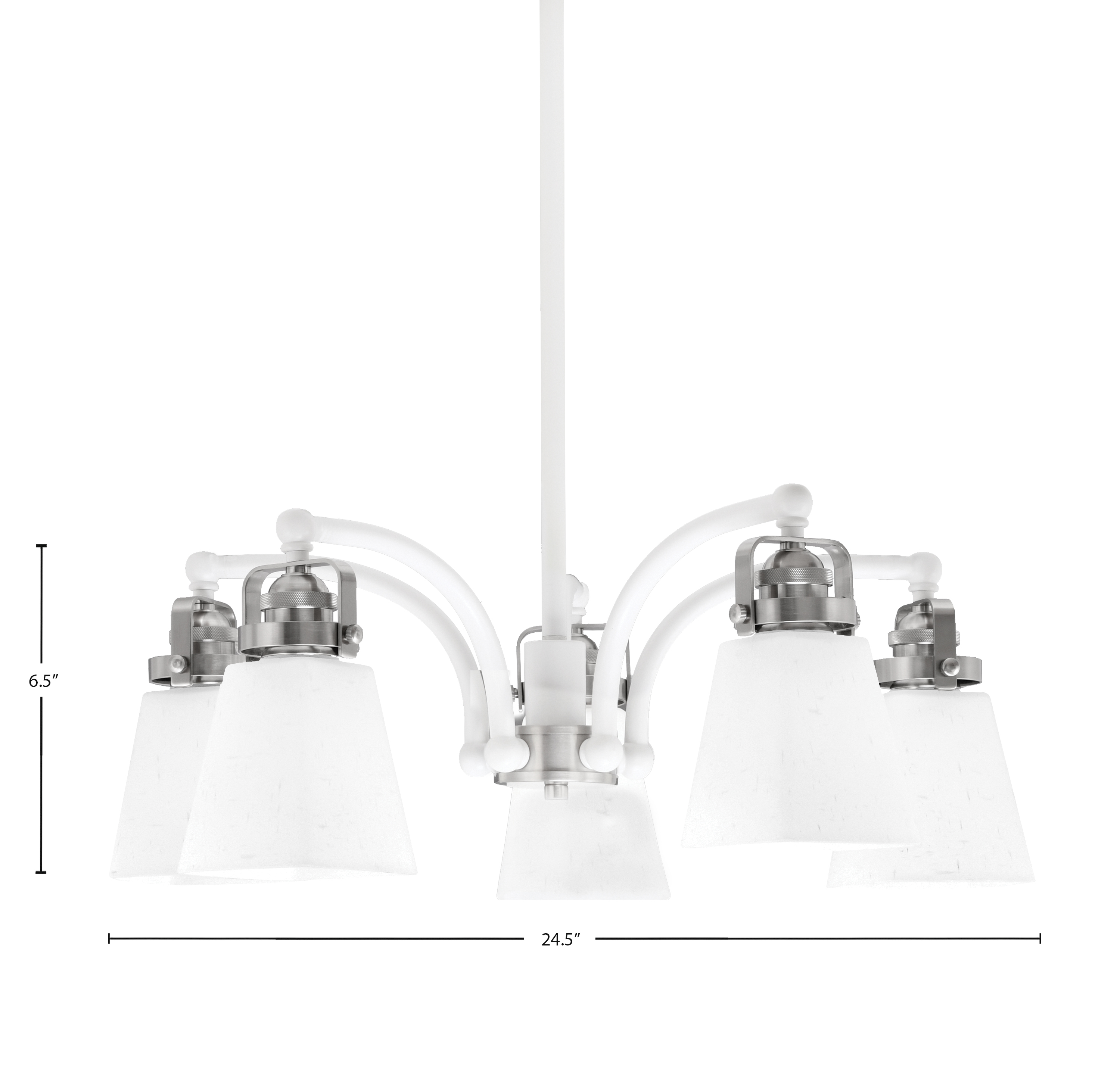 Illuminate Your Space with the Elegant Easton 5 Light, Downlight, Chandelier. Showcasing a Striking White and Brushed Nickel Finish, This Stunning Fixture Effortlessly Combines Modern Design with Classic Elements. The 4.5″ Square White Muslin Glass Diffusers Provide a Soft, Inviting Glow, Making It the Perfect Addition to Any Room.