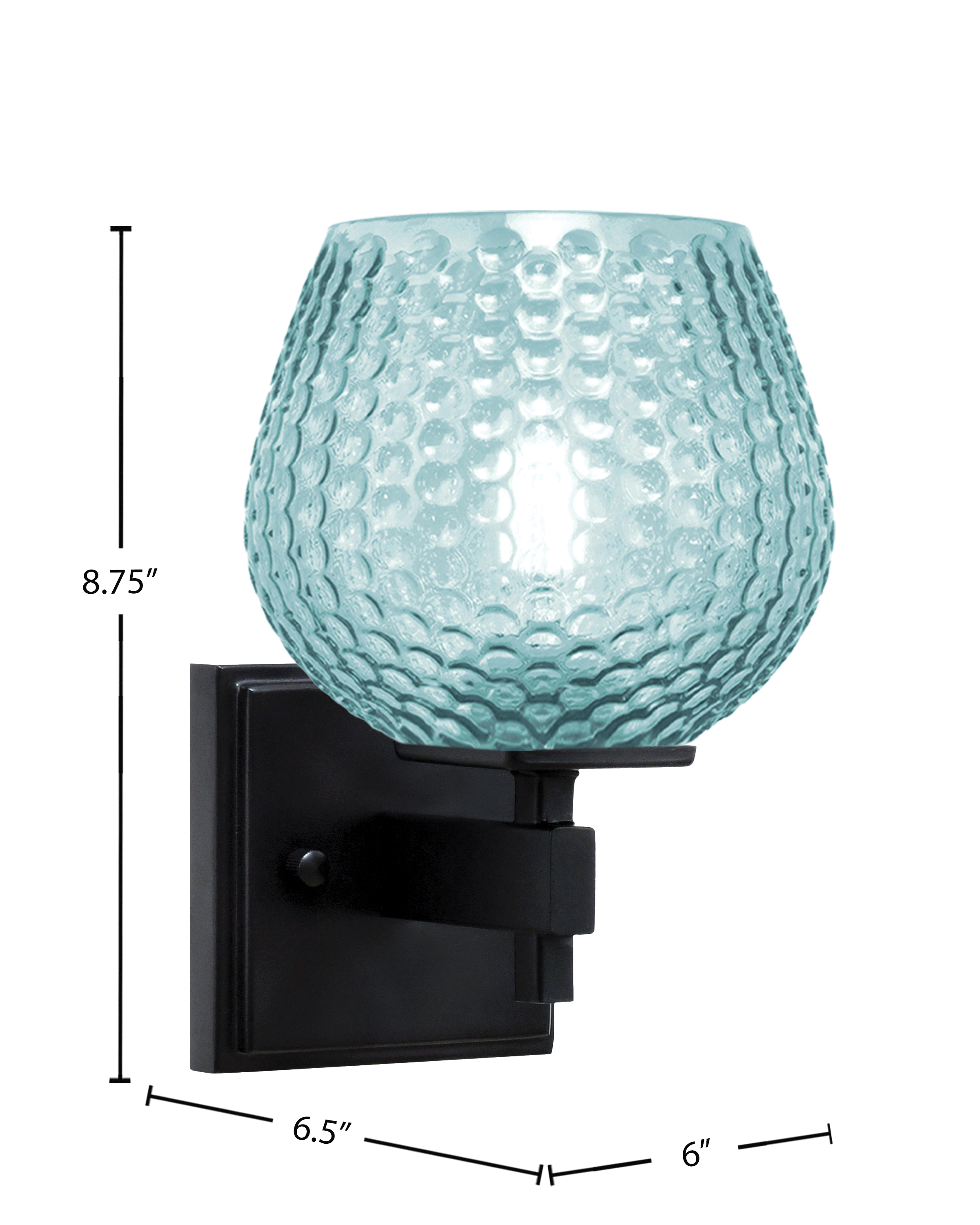 Make a striking statement with the Corbin Wall Sconce, featuring a 6″ turquoise textured glass shade that brings both color and dimension to your space. The rich turquoise hue, combined with the subtle texture of the glass, diffuses light in a way that creates a calming yet vibrant atmosphere. Paired with a sleek matte black finish, this sconce is perfect for adding a modern touch.