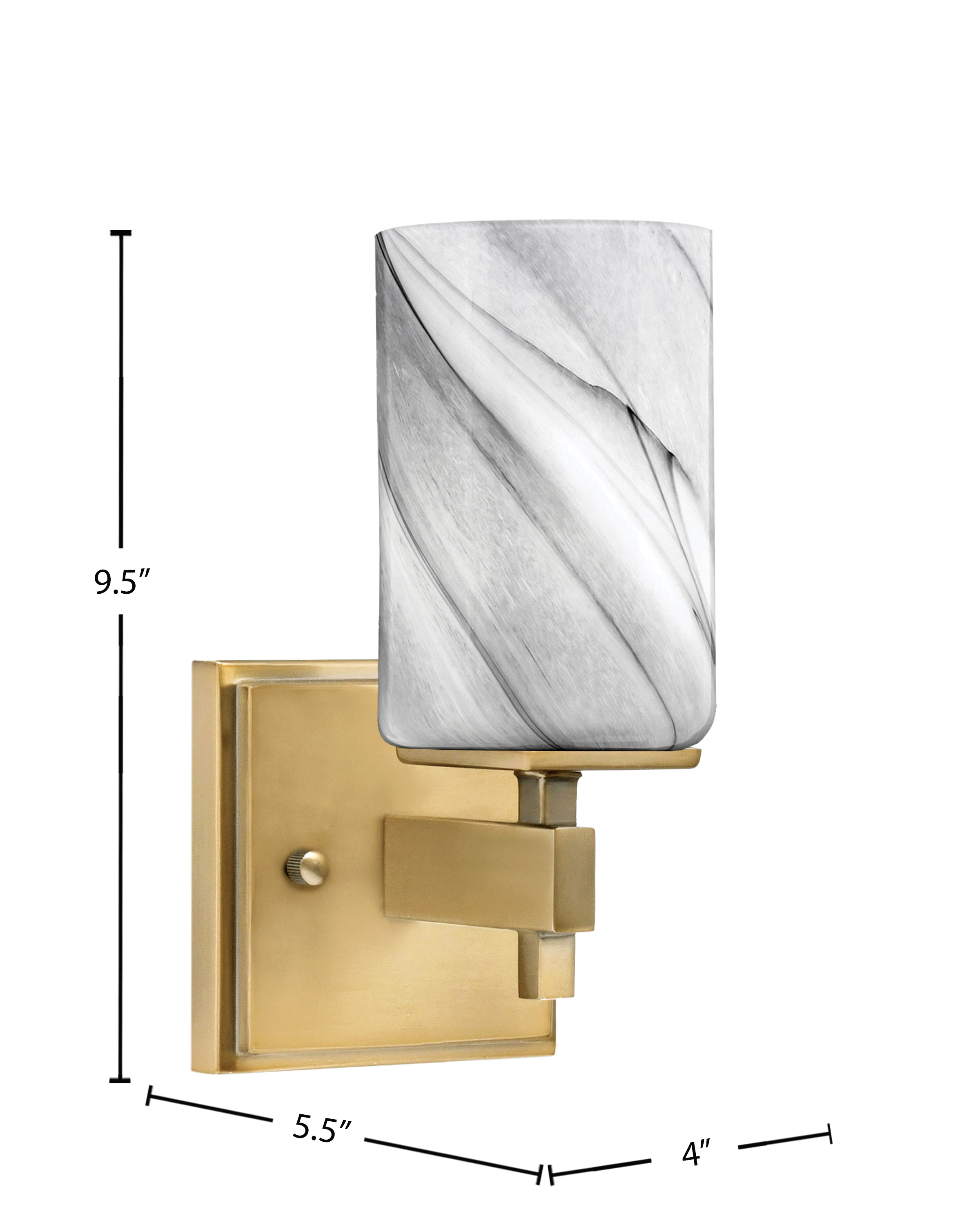 Add a touch of sophistication and artistry with the Corbin Wall Sconce, featuring a 4″ onyx swirl glass shade. The dynamic swirling patterns within the glass create a mesmerizing visual effect, while the deep tones of the onyx glass cast a soft, ambient glow. Finished in modern New Age brass, this sconce brings a bold yet refined presence to any room.