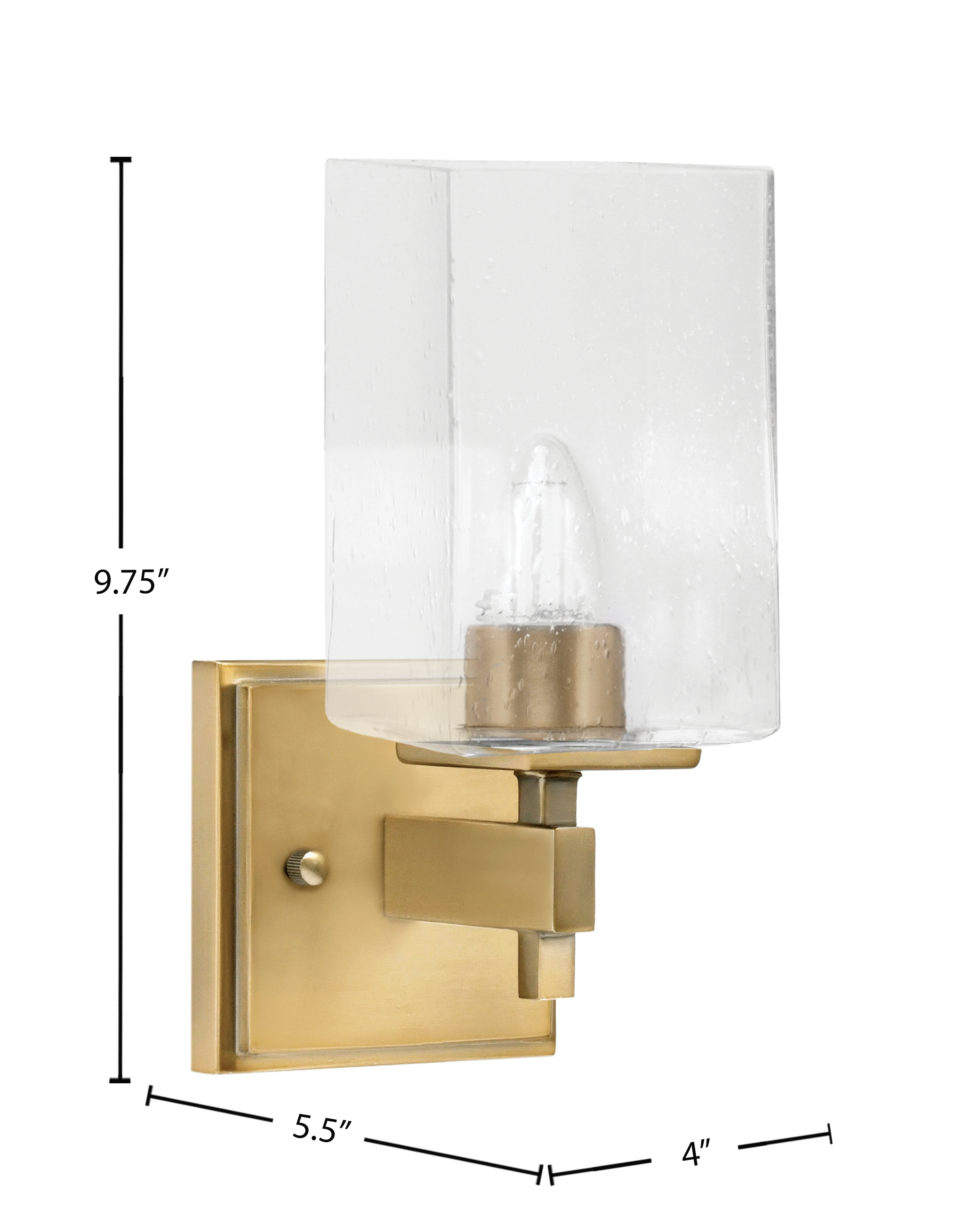 The Corbin Wall Sconce in New Age brass, featuring a 4″ square clear bubble glass shade, offers a sleek and contemporary design with a touch of artisanal charm. The clean, angular lines of the square glass provide a modern look, while the signature bubble texture diffuses light beautifully. The rich brass finish adds warmth and sophistication, making this sconce the perfect accent piece.
