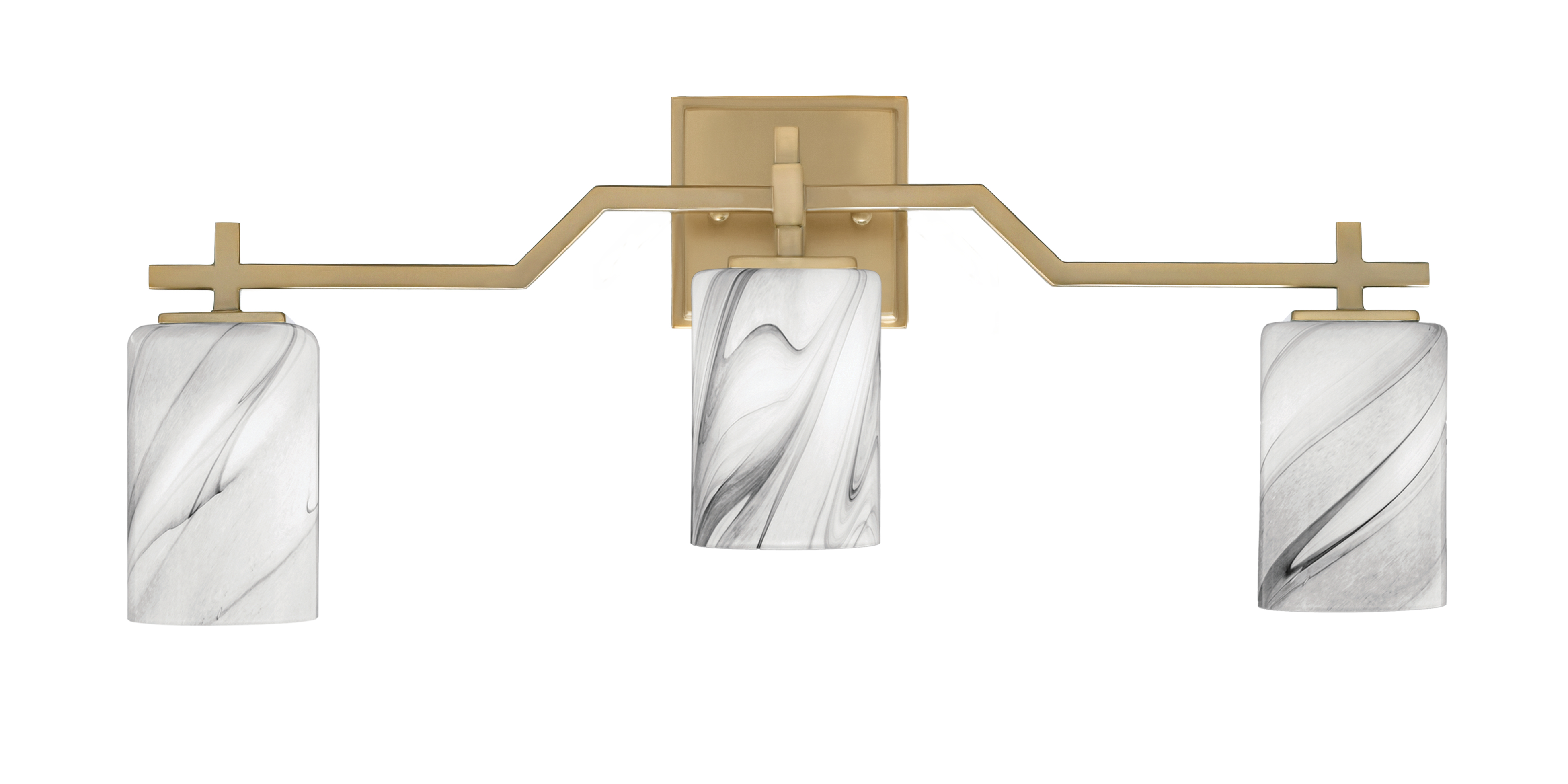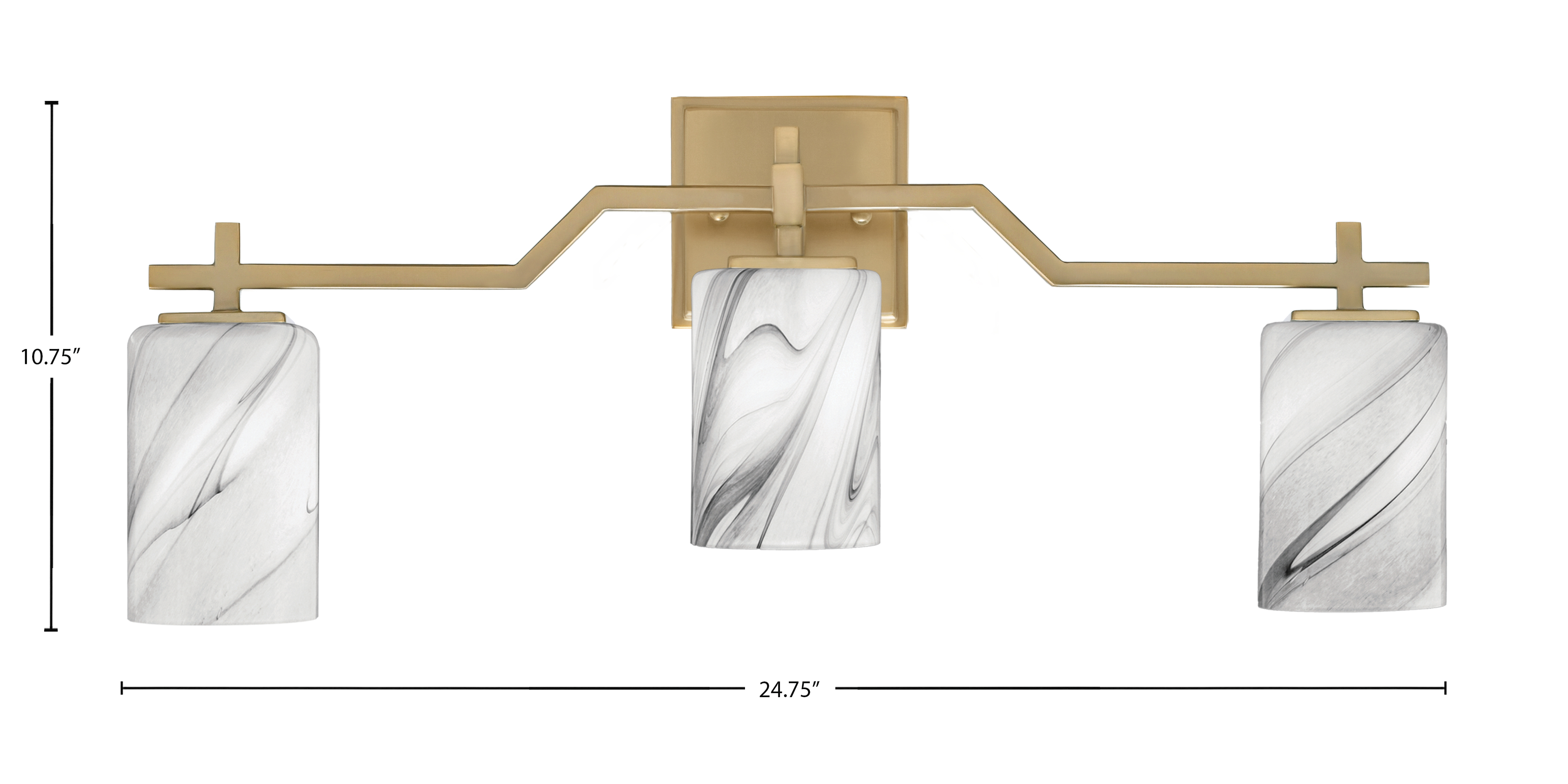 Elevate your bathroom with the dramatic contrast and artistic appeal of the Corbin 3-Light Bath Bar. The New Age Brass finish brings warmth and vintage-inspired character, while the 4-inch Onyx Swirl Glass shades feature rich, flowing patterns that add movement and depth. Perfect for those looking to make a statement.