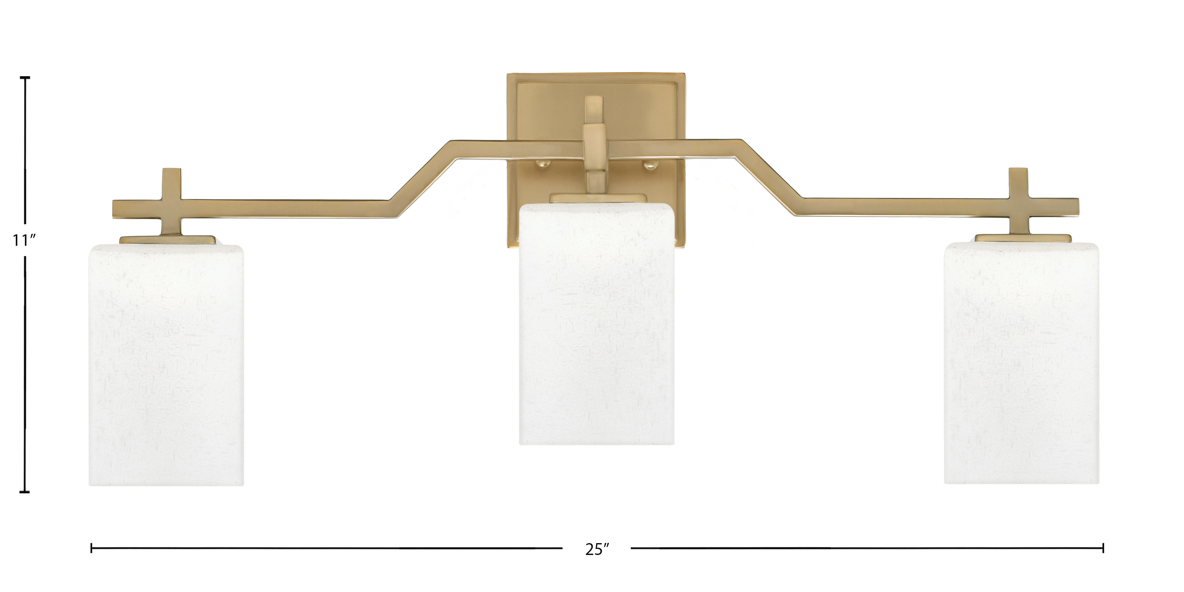 Bring sophistication and subtle texture to your bathroom with the Corbin 3-Light Bath Bar. Featuring a luxurious New Age Brass finish, this fixture is paired with 4-inch Square White Muslin Glass shades that offer a soft, fabric-like texture. The square shape adds a modern touch, while the muslin glass diffuses light beautifully.
