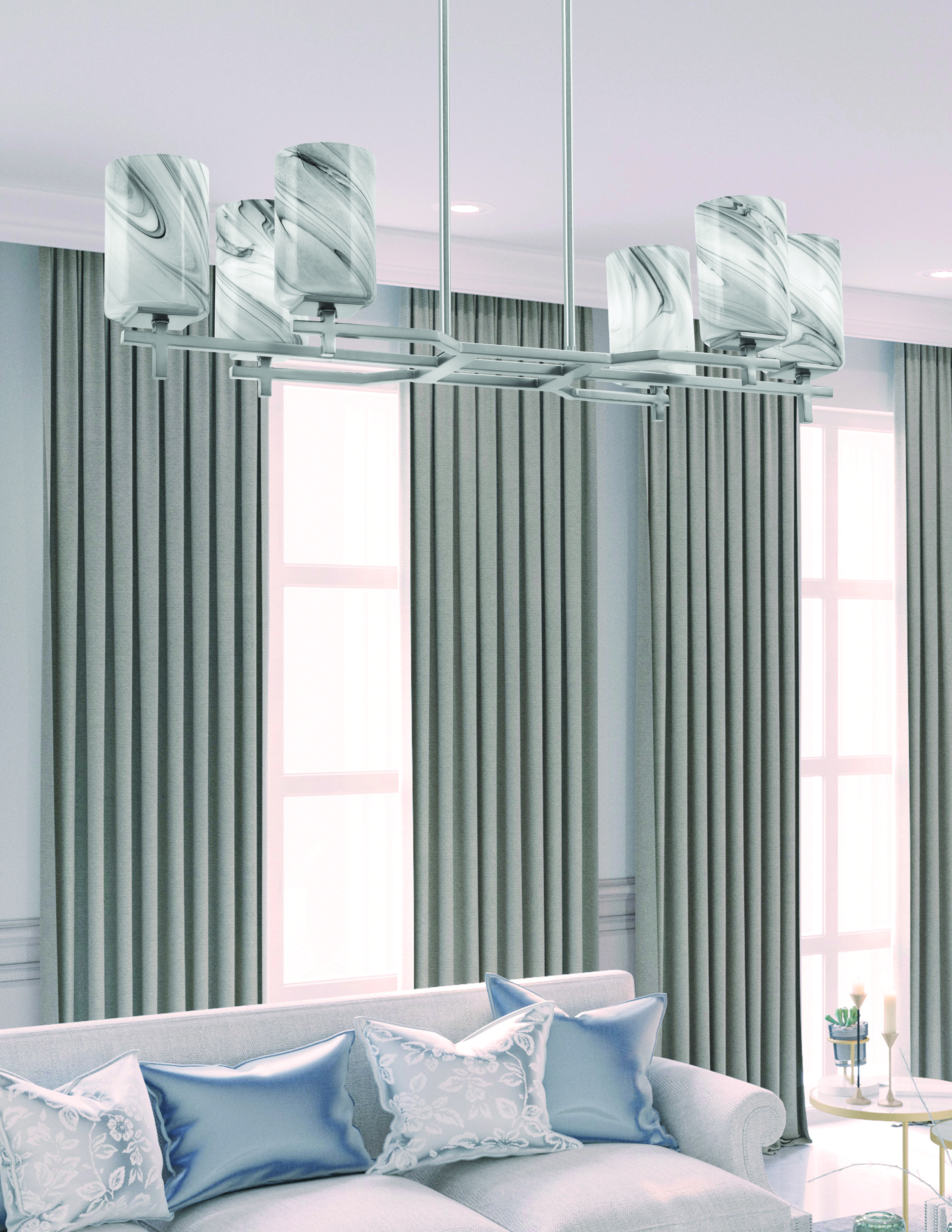 Elevate your space with the Corbin 6-Light Island Light, featuring a striking Graphite finish and six 4″ onyx swirl glass shades. The swirling patterns in each shade create a dynamic, one-of-a-kind look, casting a rich, ambient light that adds character and warmth to any room. Perfect for kitchens, dining areas, or modern interiors.