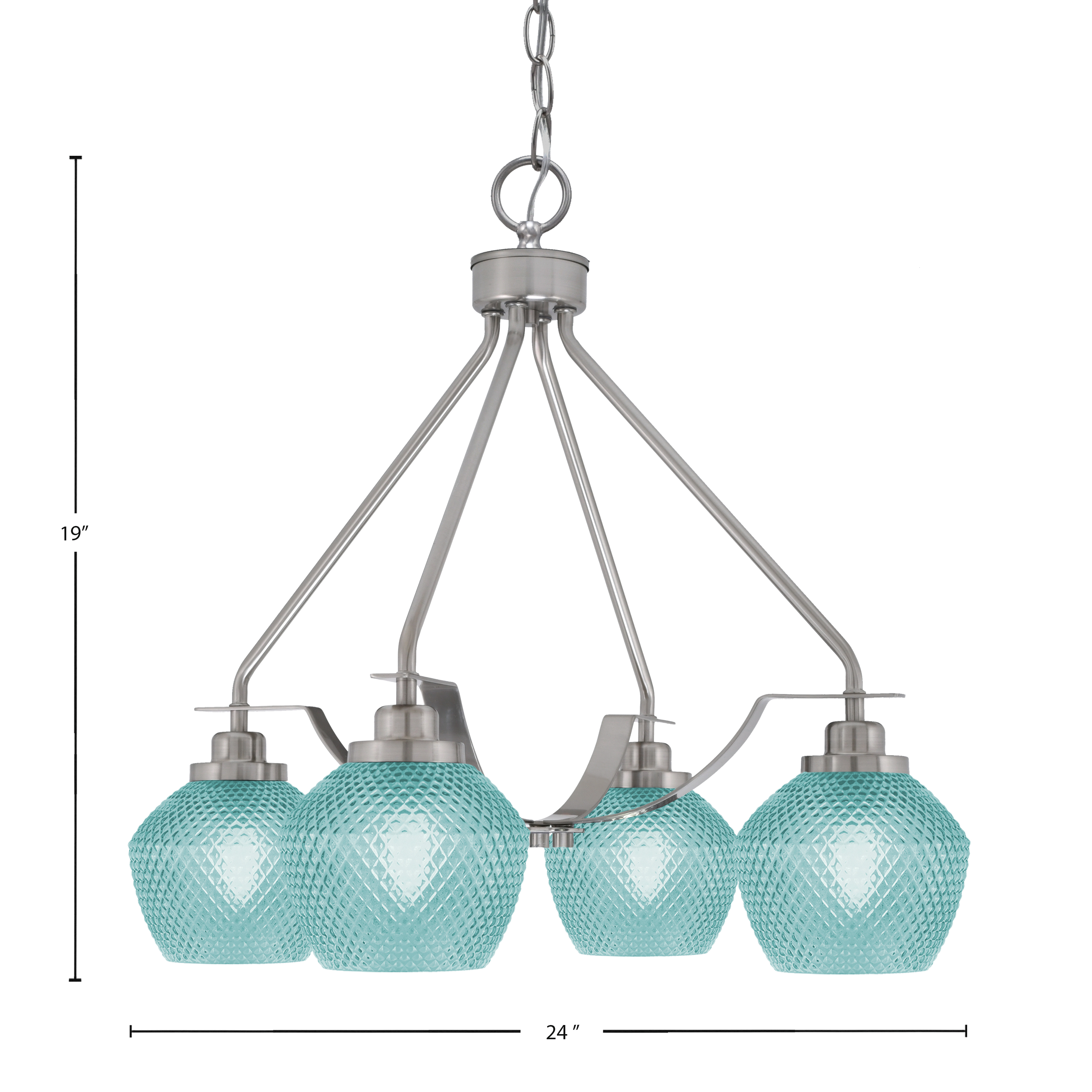 Bring a lively touch of color and modern style to your space with the Odyssey 4 Light Chandelier. Featuring a sleek Brushed Nickel Finish, this chandelier is paired with four 6″ Turquoise Textured Glass shades that softly diffuse light. Its clean, modern design makes it a stylish focal point in any room.