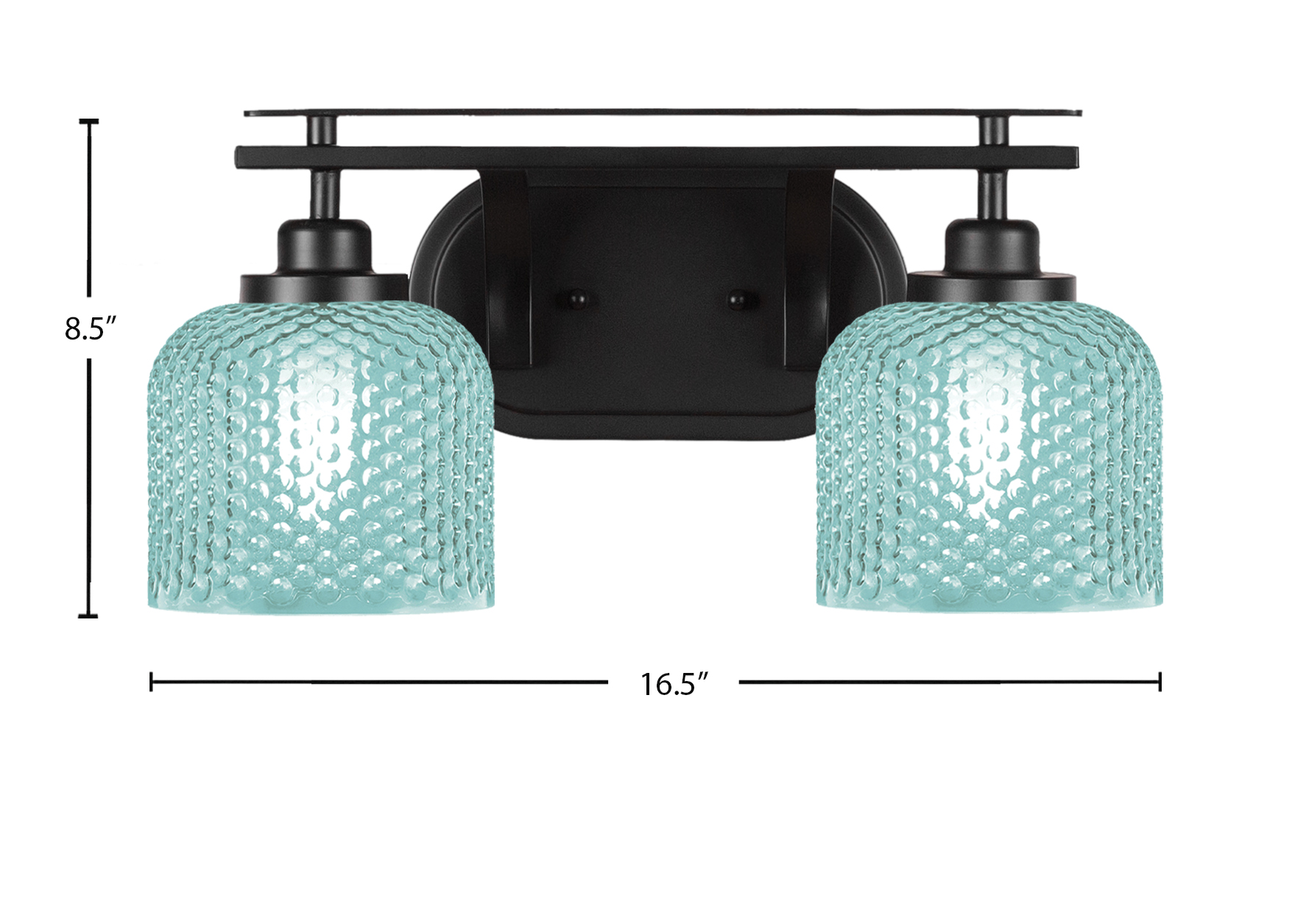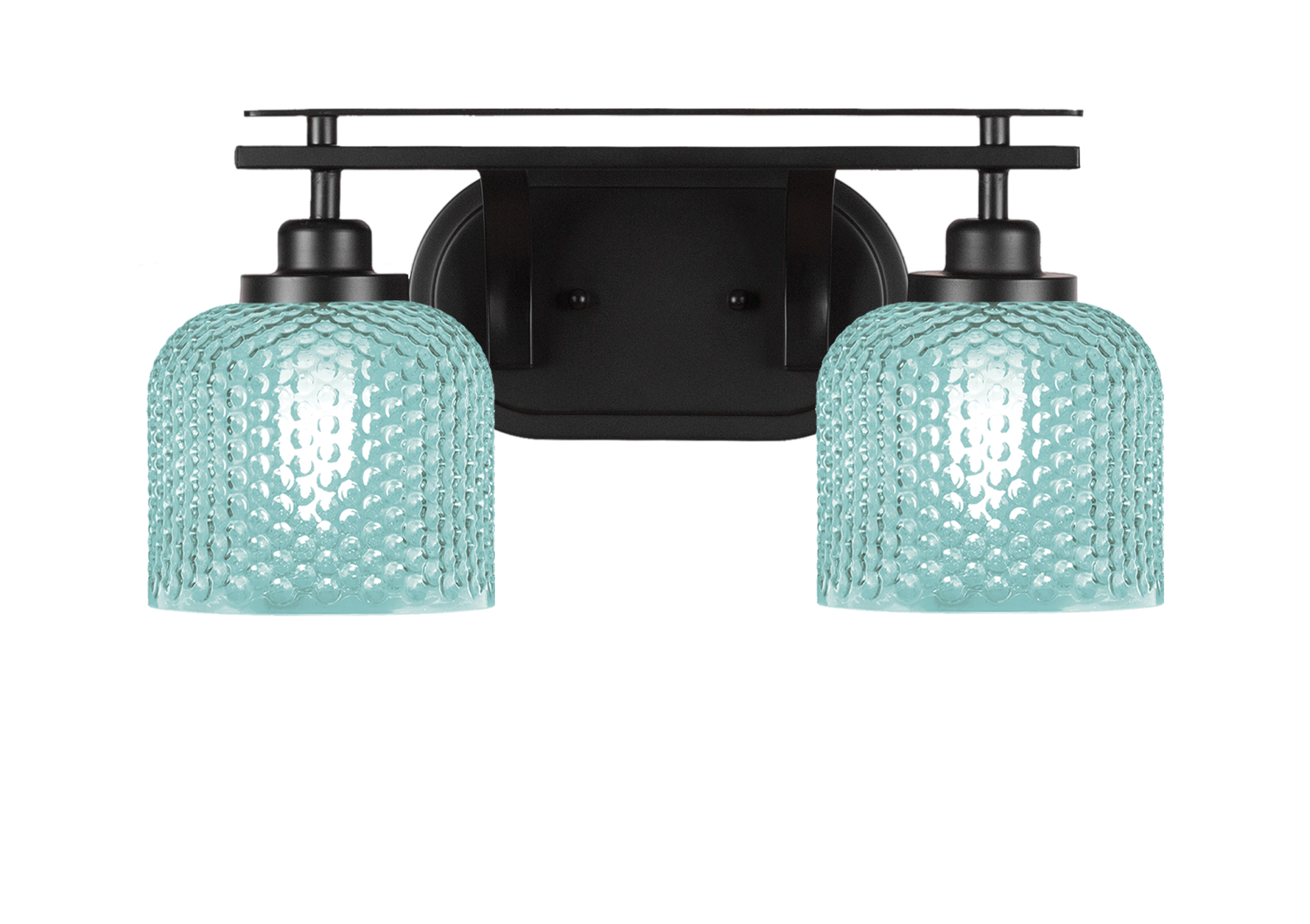 Bring a fresh, modern touch to your bathroom with the Odyssey 2 Light Bath Bar. Featuring a Matte Black Finish and 6-inch Turquoise Textured Glass shades. The 6″ Turquoise Textured Glass shades diffuse light softly, casting a warm and inviting glow while adding a pop of color to your décor.