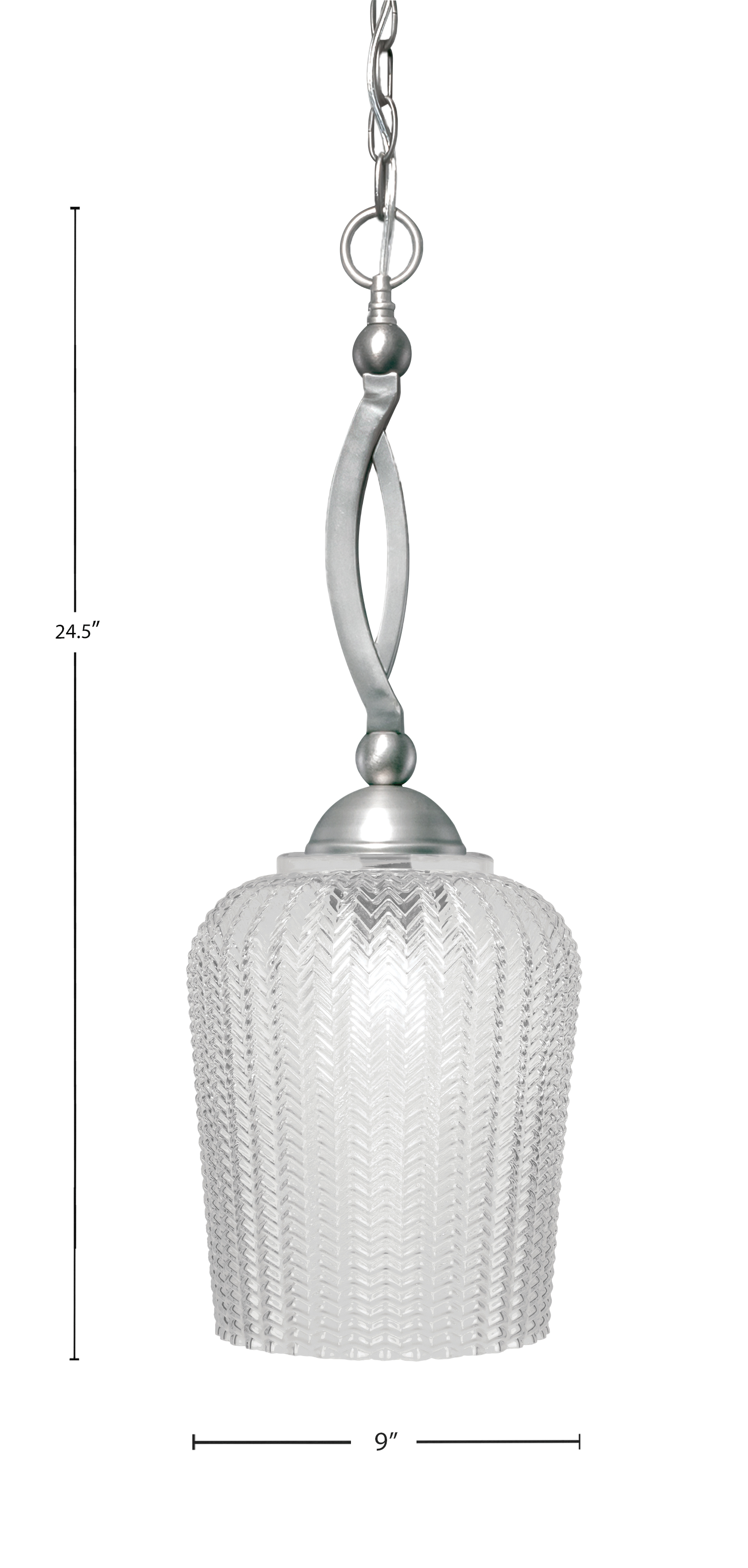 The Bow Chain Hung Pendant brings a touch of elegance and contemporary style to any space. Its brushed nickel finish offers a sleek, versatile look that pairs well with a variety of interiors, while the 9″ clear textured glass adds visual interest and softly diffuses light for a warm, inviting glow. Ideal for kitchen islands, dining areas, or entryways, this pendant provides both style and functional illumination.