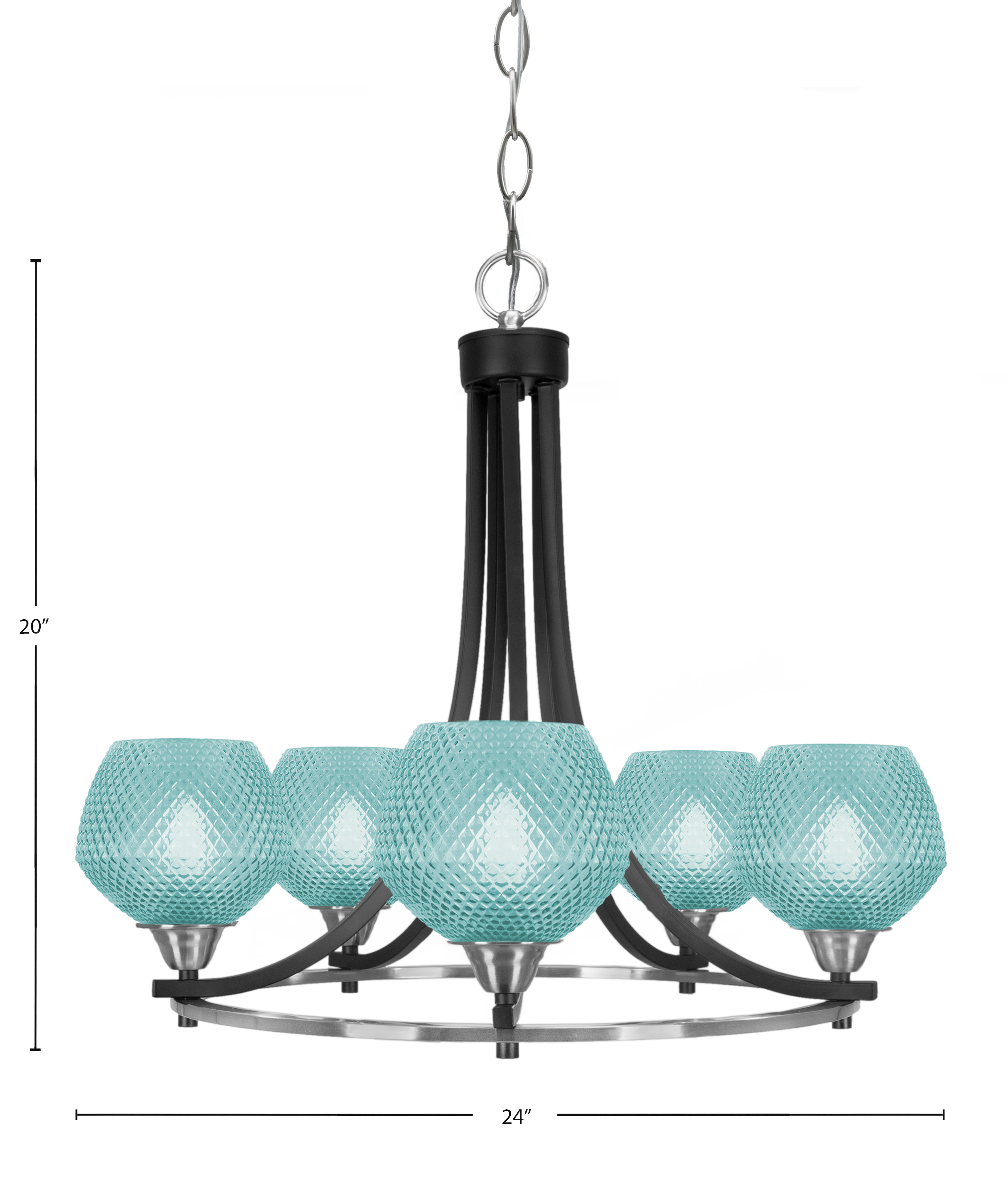 Illuminate your space with the elegant Paramount 5 Light Uplight Chandelier. Featuring a sophisticated blend of Matte Black and Brushed Nickel Finishes paired with vibrant 6-inch Turquoise Textured Glass shades. This chandelier seamlessly combines modern industrial design with a refreshing pop of color, making it an eye-catching focal point for dining rooms, foyers, or living areas.