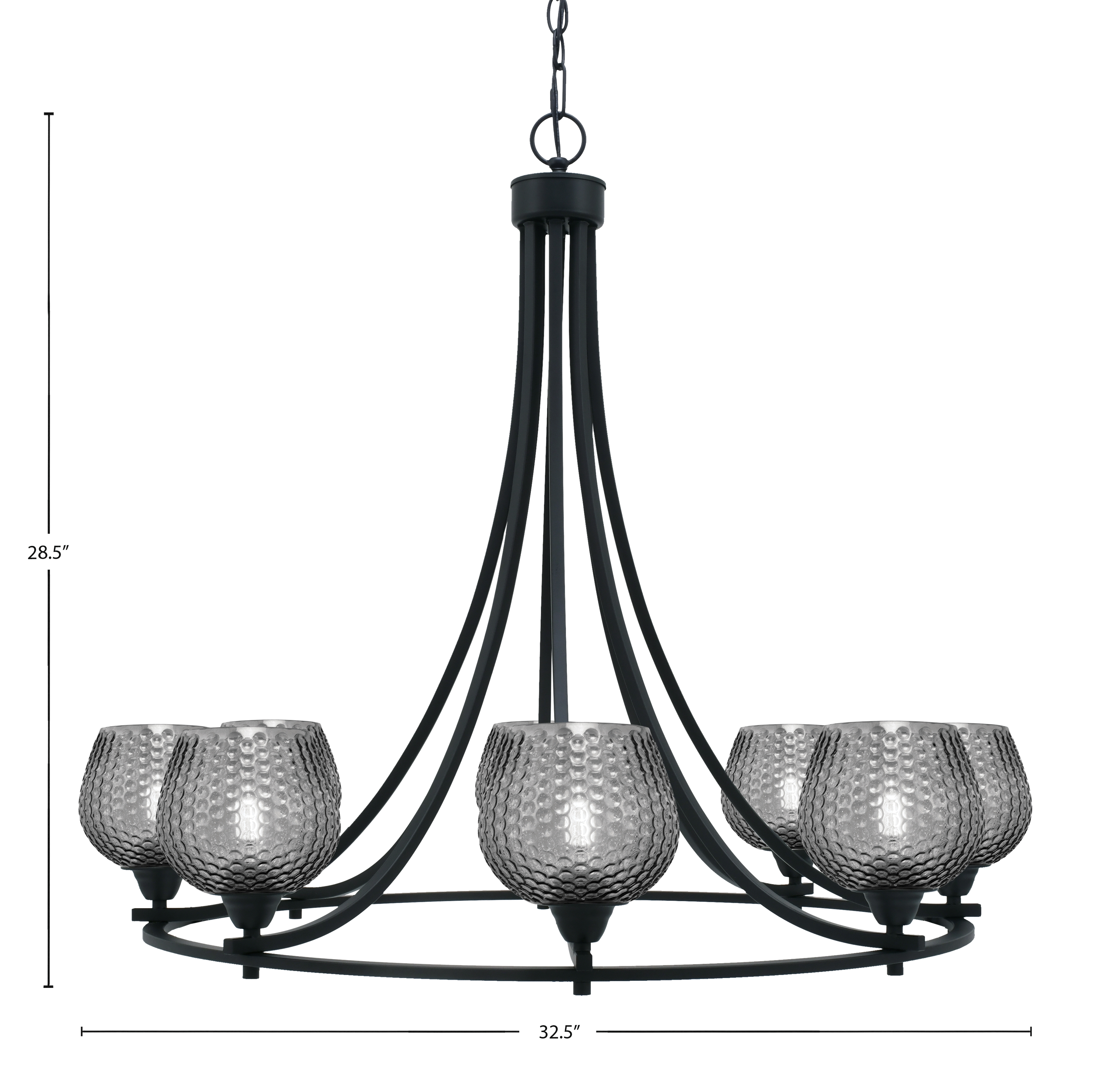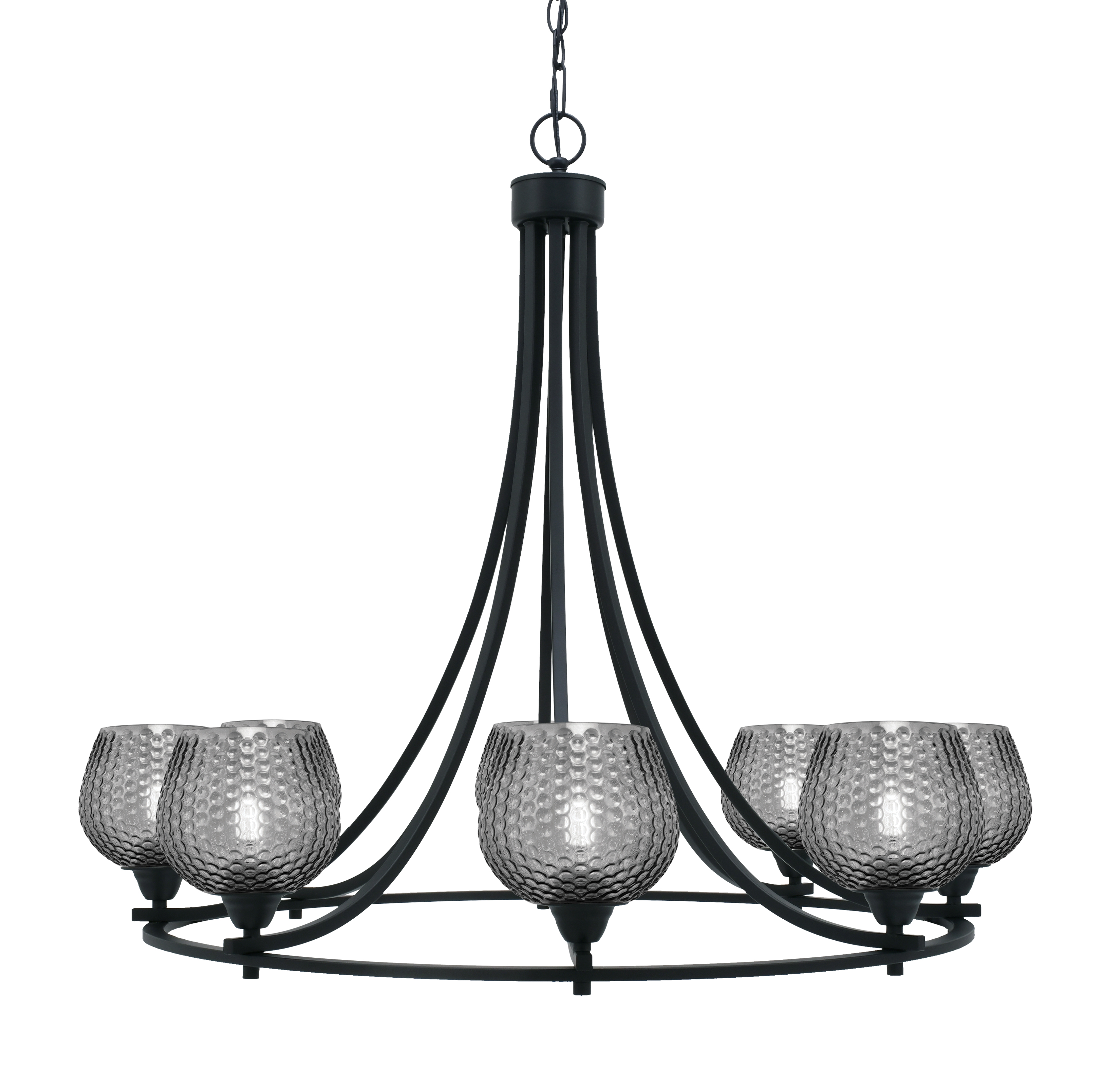 Create a striking focal point with the Paramount 8 Light Chandelier. Featuring a matte black finish and 6″ smoke textured glass shades, this fixture combines sleek design with subtle texture. Its uplight configuration fills the room with soft, even illumination.