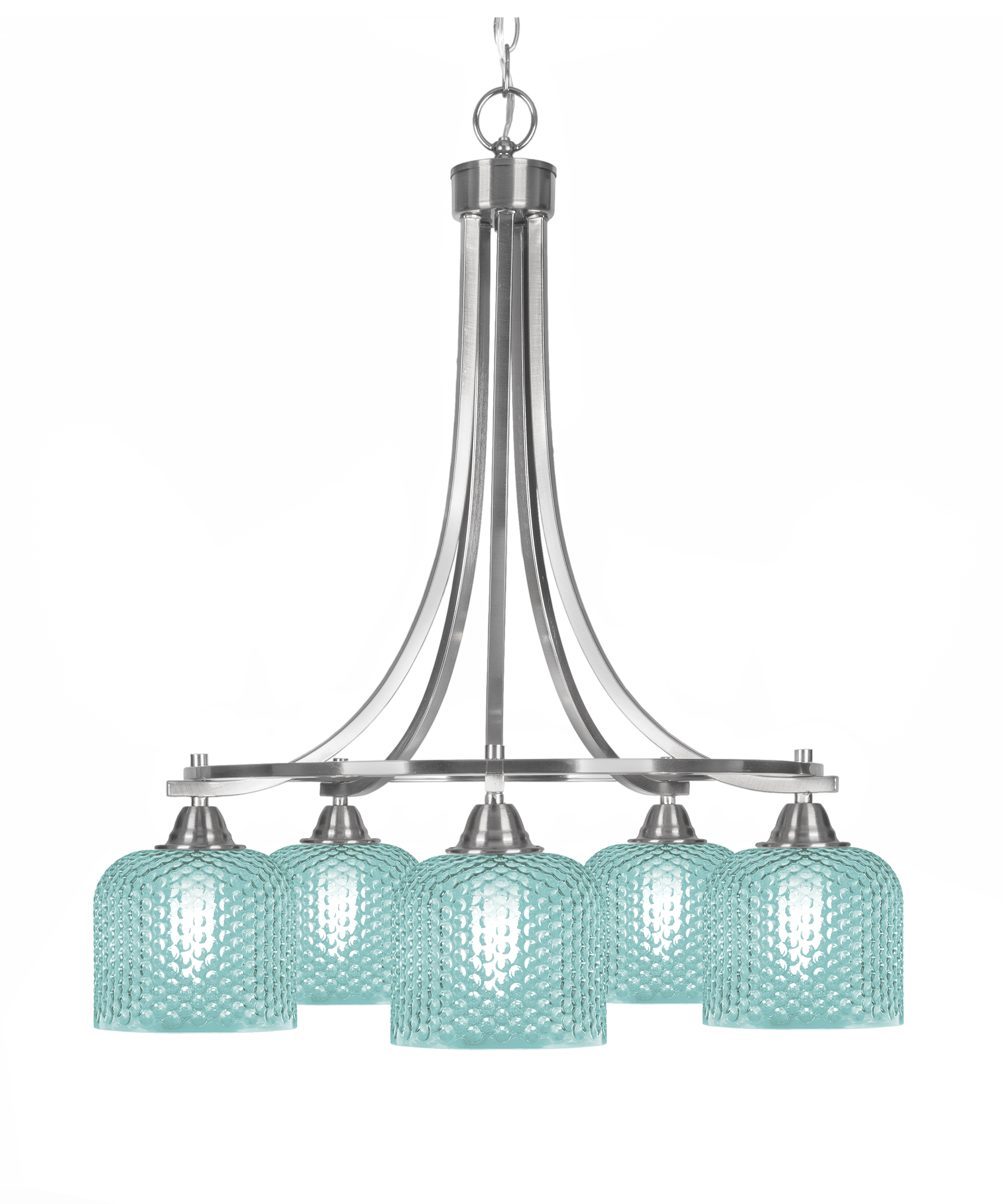 Vibrant and contemporary, the Paramount 5 Light Downlight Chandelier brings bold color and refined style. The clean, modern brushed nickel finish offers a versatile and elegant look that pairs effortlessly with a range of decor styles. Five handcrafted turquoise textured glass shades introduce vivid color and eye-catching texture, casting a warm, inviting glow.