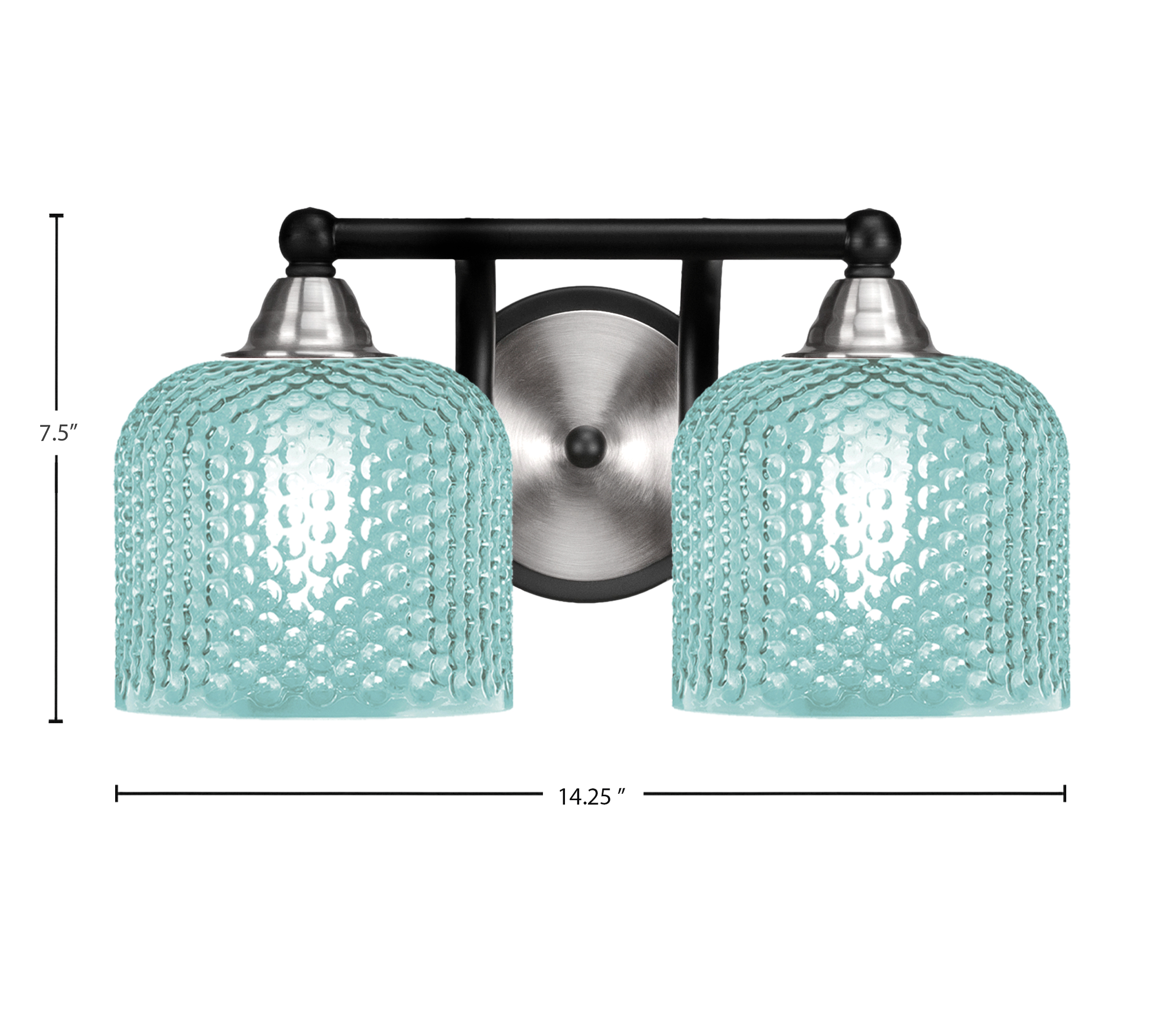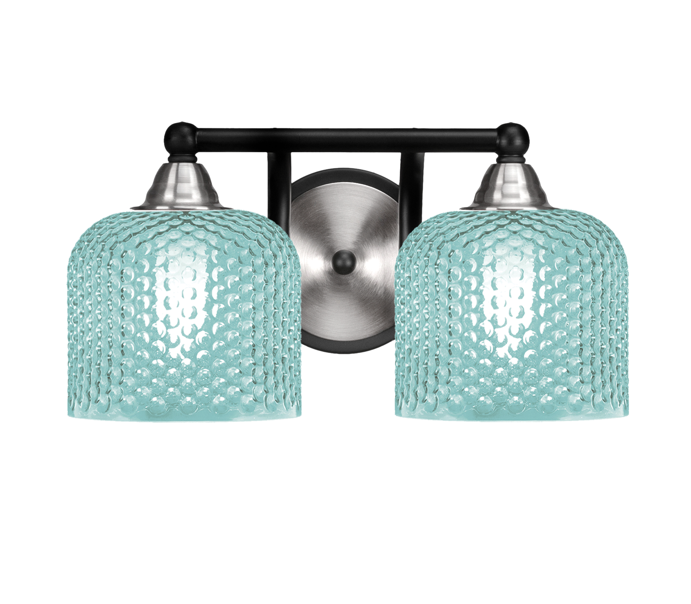 Bold yet refined, the Paramount 2-Light Bath Bar brings a splash of color and contemporary style to your lighting design. This striking fixture features a sleek combination of Matte Black and Brushed Nickel finishes. The 6″ Turquoise Textured Glass shades bring a refreshing pop of color and subtle texture, casting a vibrant yet soft glow that adds character to any bathroom or vanity area.