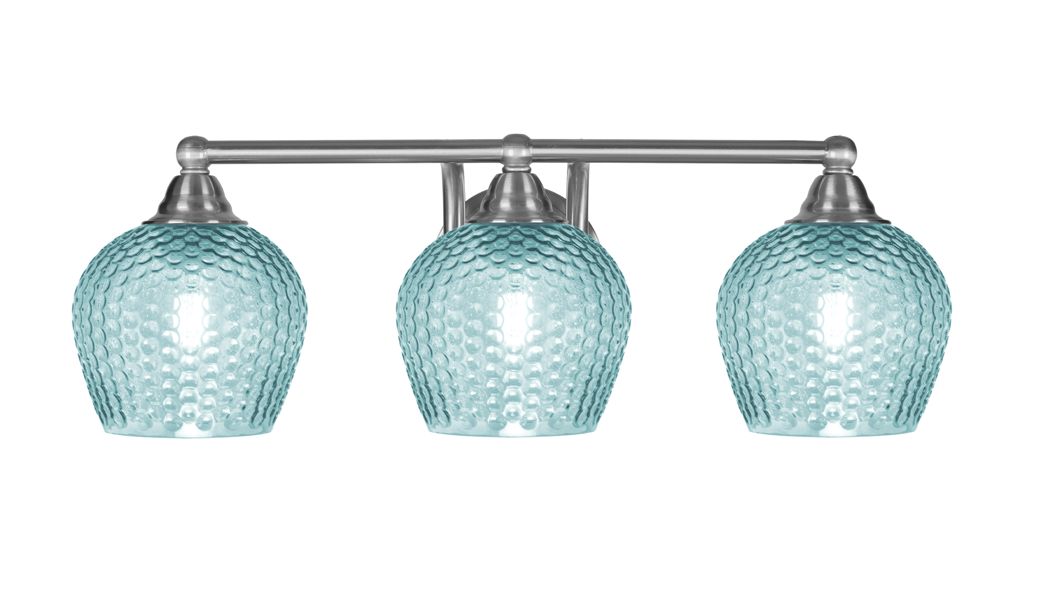 Brighten your space with the bold, modern charm of the Paramount 3 Light Bath Bar. Finished in sleek Brushed Nickel, this contemporary fixture features three 6″ Turquoise Textured Glass shades that bring a vibrant pop of color and a rich surface texture. The glass casts a dynamic glow, adding depth and personality to bathrooms, vanity areas, or dressing spaces.