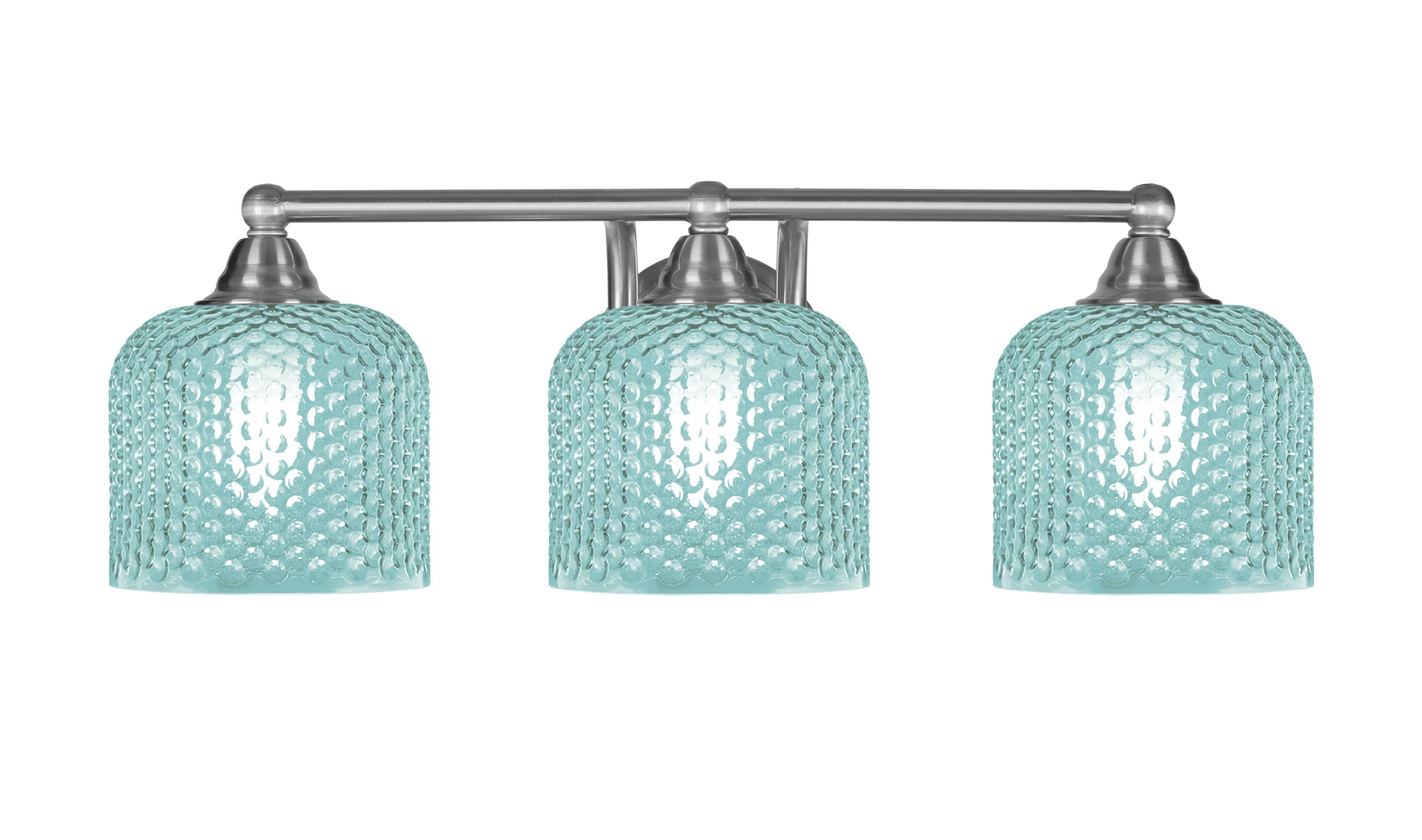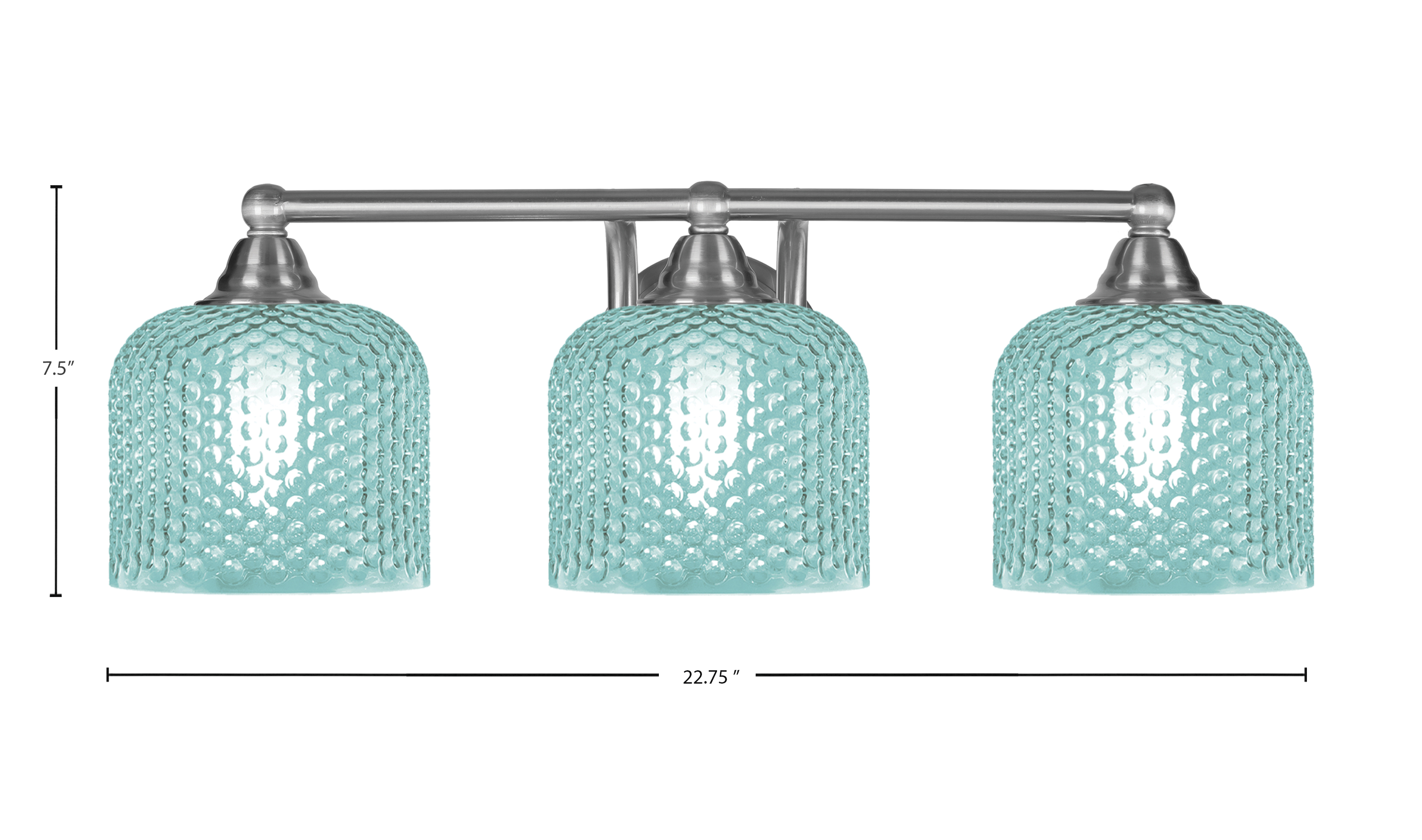 Brighten your bathroom with a splash of color and contemporary charm. The Paramount 3 Light Bath Bar features a sleek brushed nickel finish paired with three 6″ Turquoise Textured glass shades that bring bold personality and artisanal flair. The richly textured glass casts a soft, vibrant glow—perfect for elevating vanities and powder rooms.