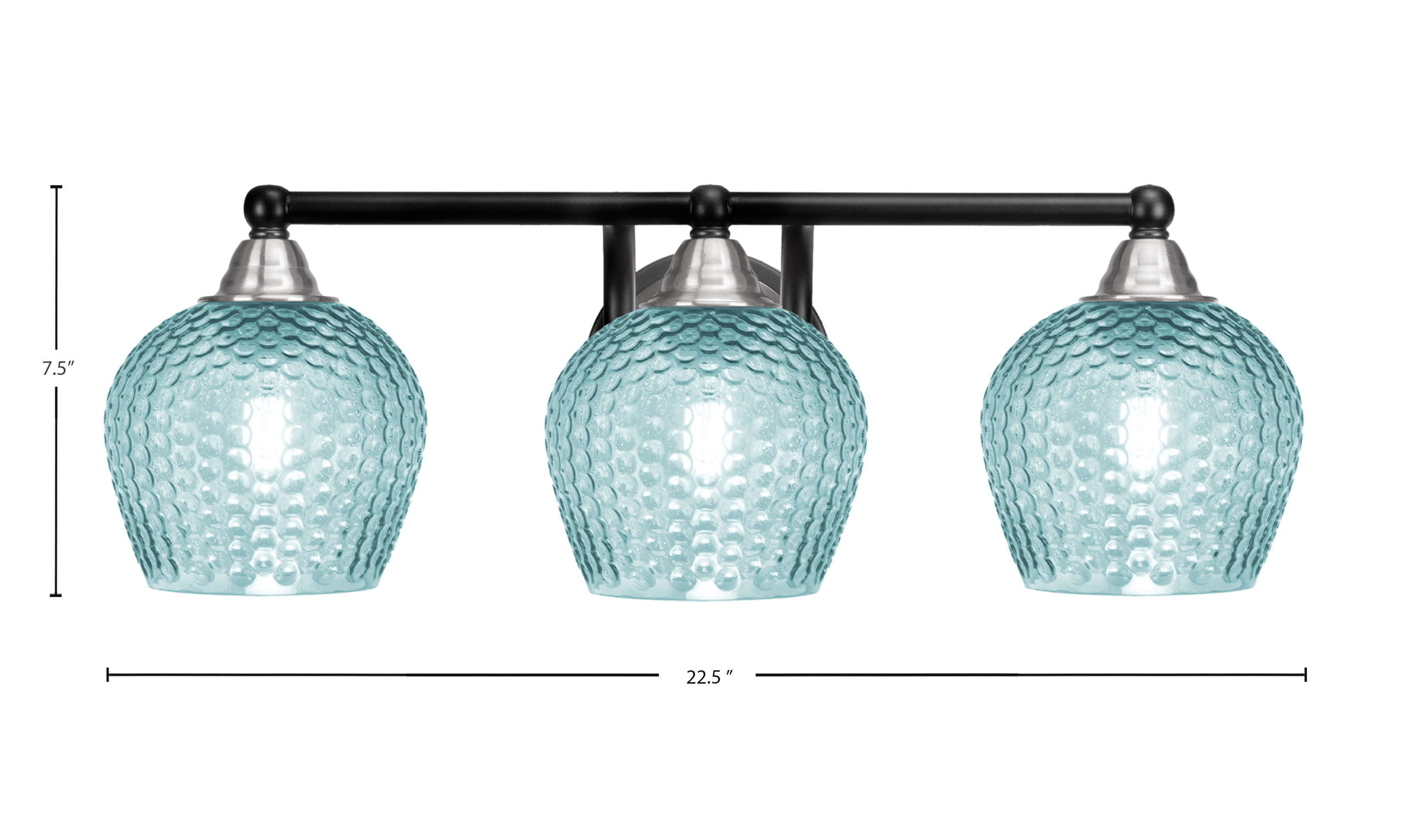 A striking blend of color, texture, and finish, the Paramount 3 Light Bath Bar adds artistic flair to any bath space. Matte black and brushed nickel finishes provide sleek contrast, while three 6″ turquoise textured glass shades ripple with color and character. Perfect for interiors that embrace bold expression and contemporary design.