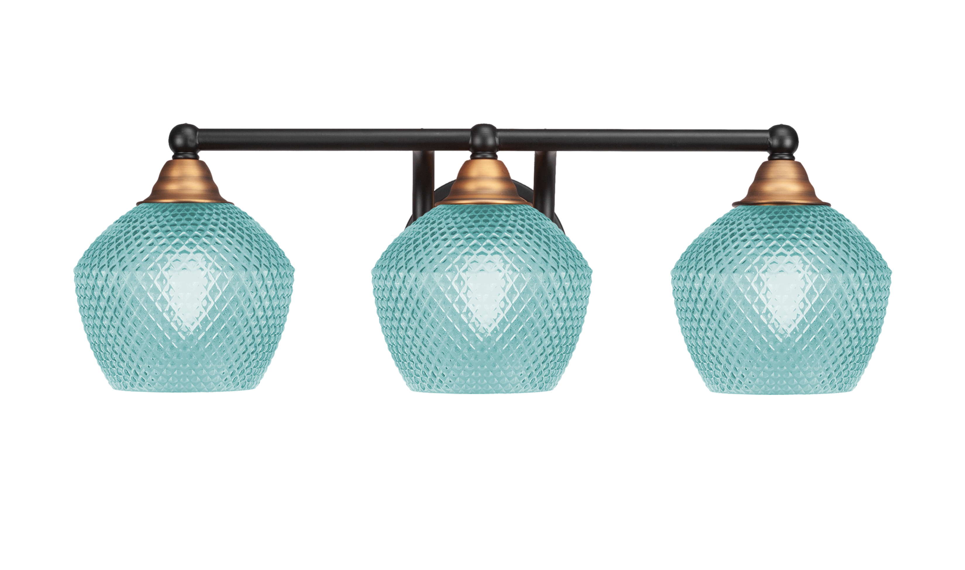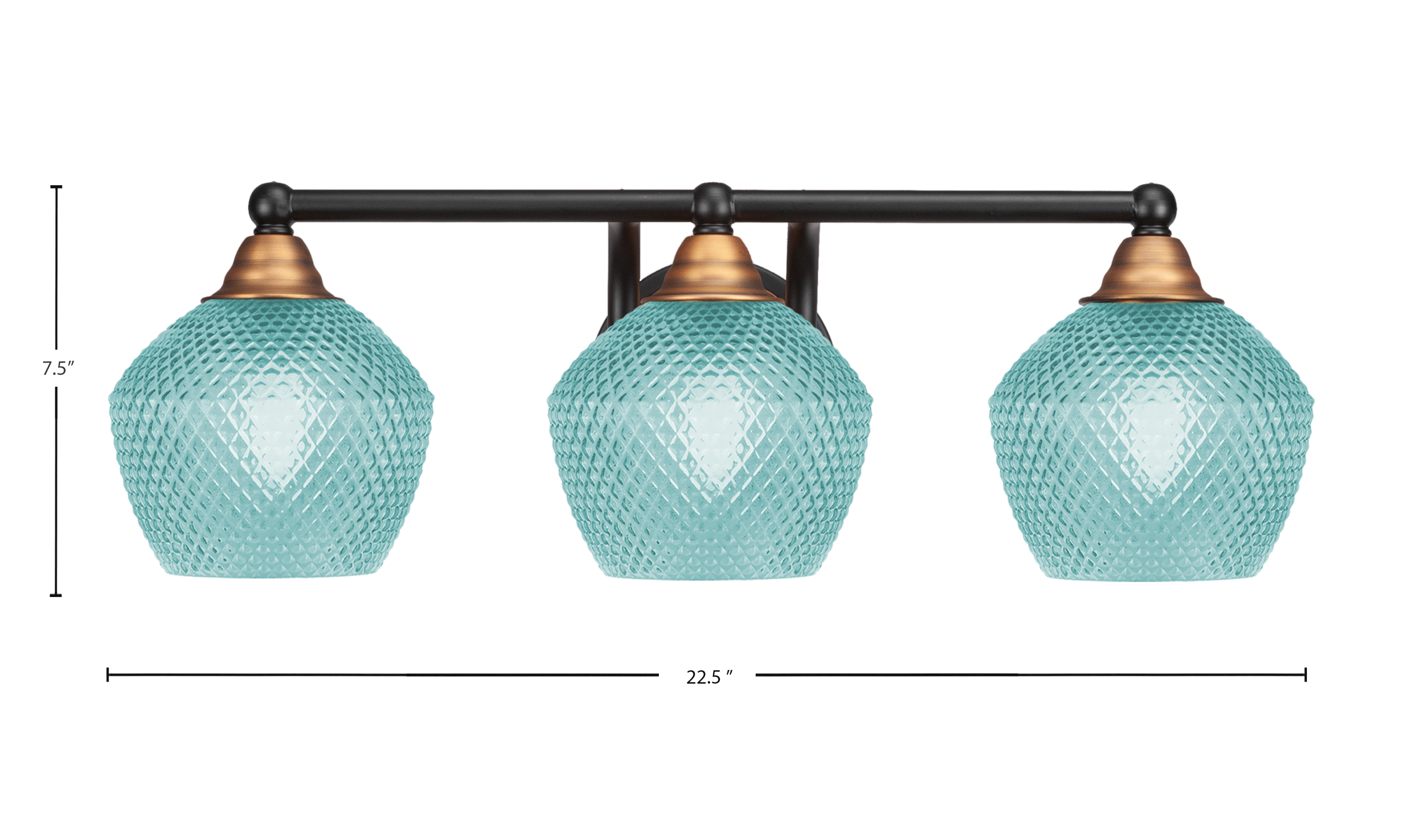 Add a bold pop of color and contemporary charm to your space with the Paramount 3 Light Bath Bar. Featuring a sleek Matte Black and Brass finish, this fixture is elevated by 6″ turquoise textured glass shades that create a vibrant, artful glow. The rich hue brings energy and character, while the texture softly diffuses light for a warm, inviting ambiance.