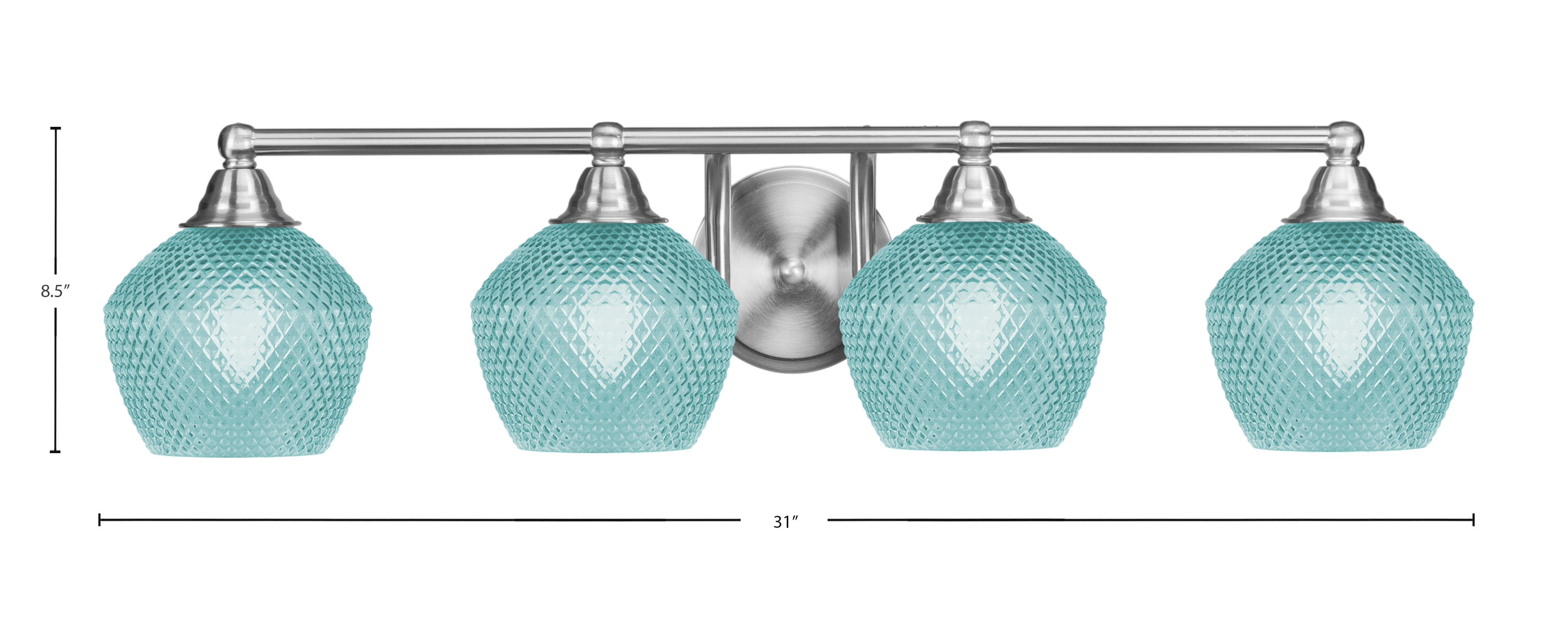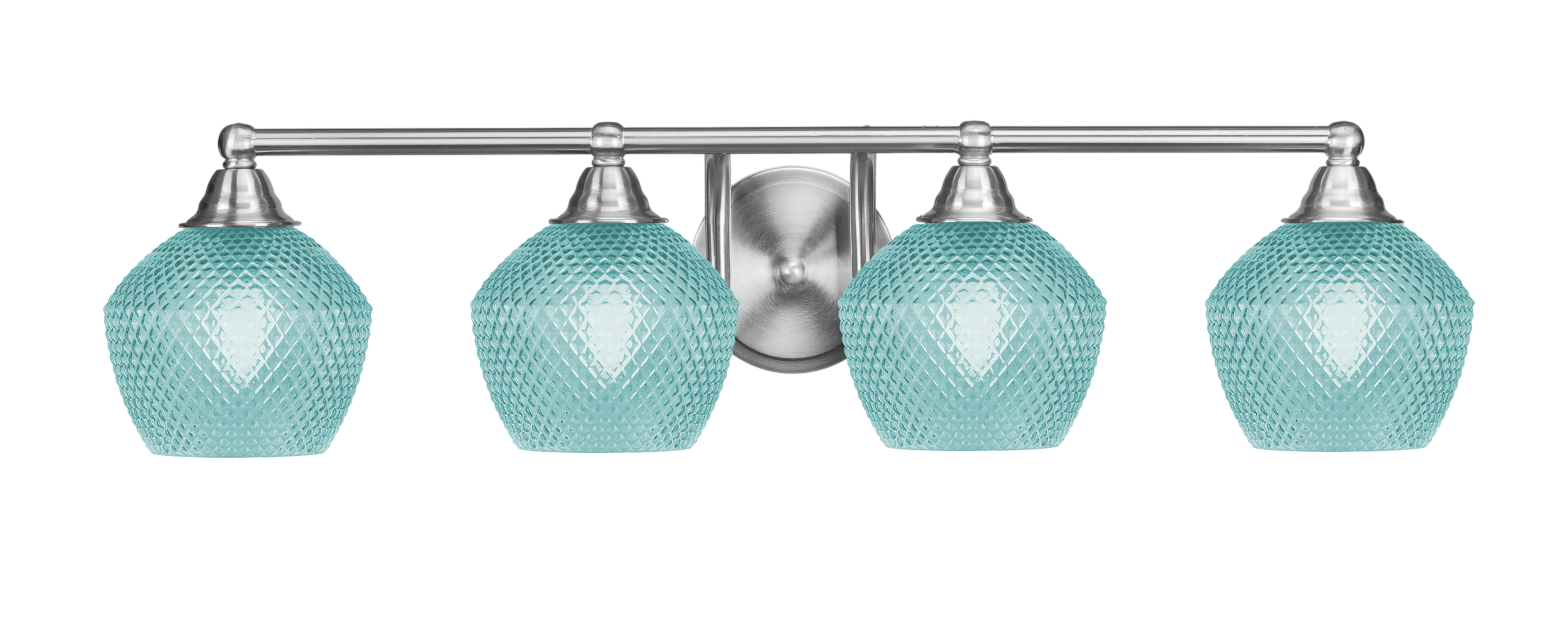 Elevate your bathroom’s style with the Paramount 4 Light Bath Bar, featuring a sophisticated brushed nickel finish paired with eye-catching 6″ Turquoise Textured Glass shades. The turquoise glass shades showcase a rich, textured pattern that diffuses light casting a soft, colorful glow that adds personality and warmth to your bathroom. The combination of the cool brushed nickel frame and vibrant glass creates a striking contrast that complements modern and eclectic interiors.