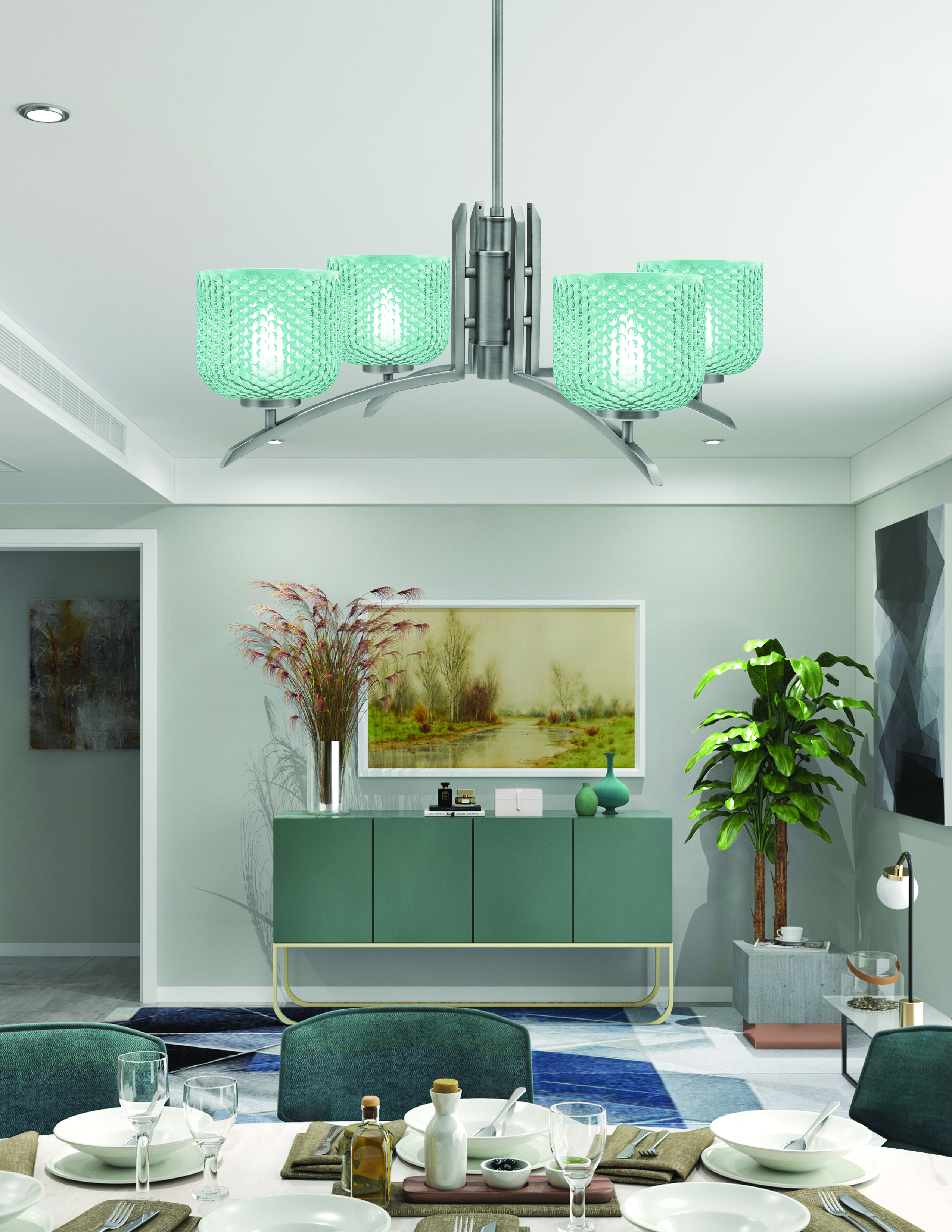 Enhance your home decor with the vibrant and contemporary Toltec Lighting Kurve 4 Light Chandelier. Finished in graphite, this chandelier complements modern and transitional interiors alike. It features four lights adorned with 6″ turquoise textured glass shades. The turquoise color and texture add a striking visual appeal, diffusing light gently and creating a lively atmosphere in any room.