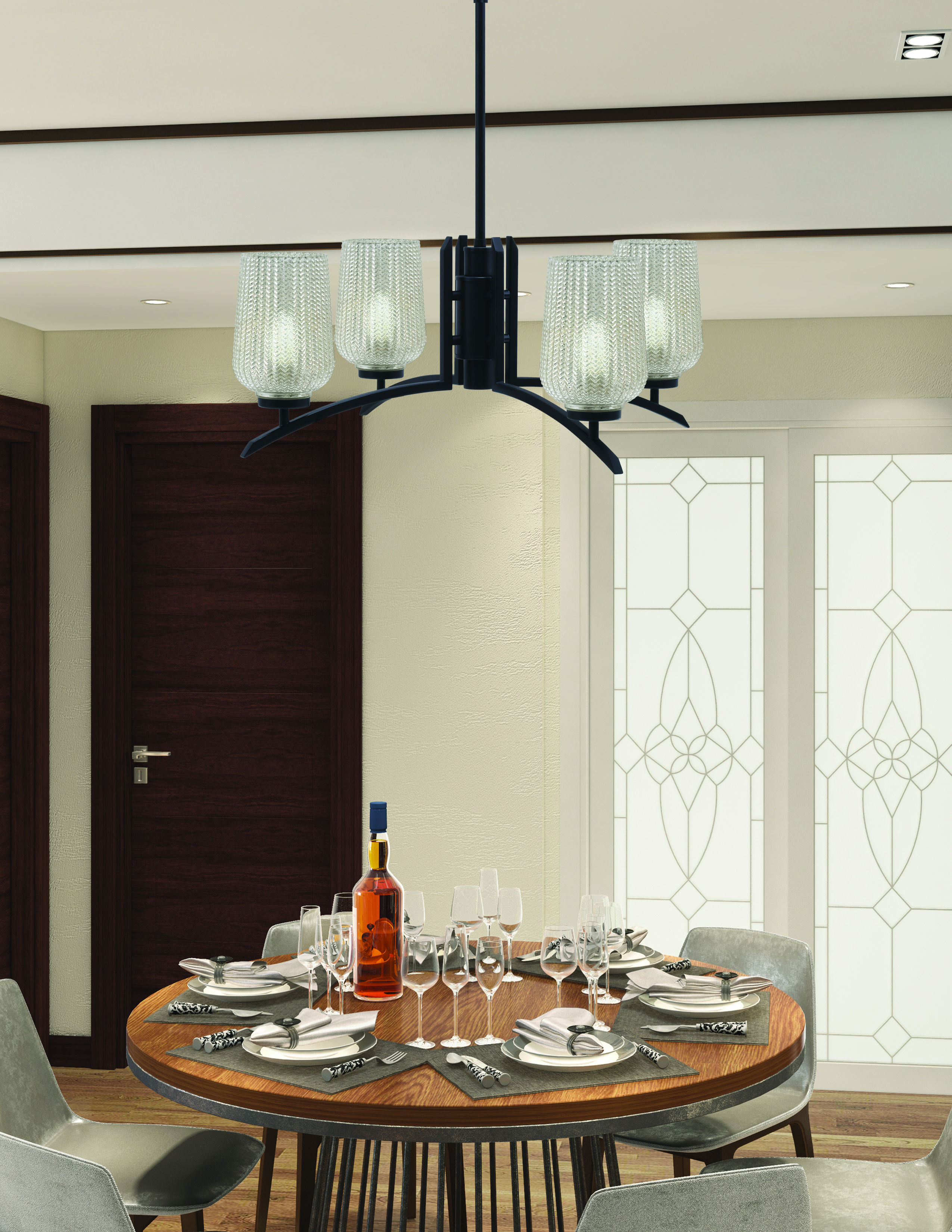 Illuminate Your Space with the Stunning Kurve 4 Light Chandelier, Featuring a Striking Matte Black Finish that Complements Any Decor. This Elegant Chandelier Showcases 5″ Silver Textured Glass Shades, Creating a Beautiful Play of Light and Shadow. Perfect for Dining Areas or Living Rooms, This Fixture Add a Touch of Modern Charm and Sophistication to Your Home.