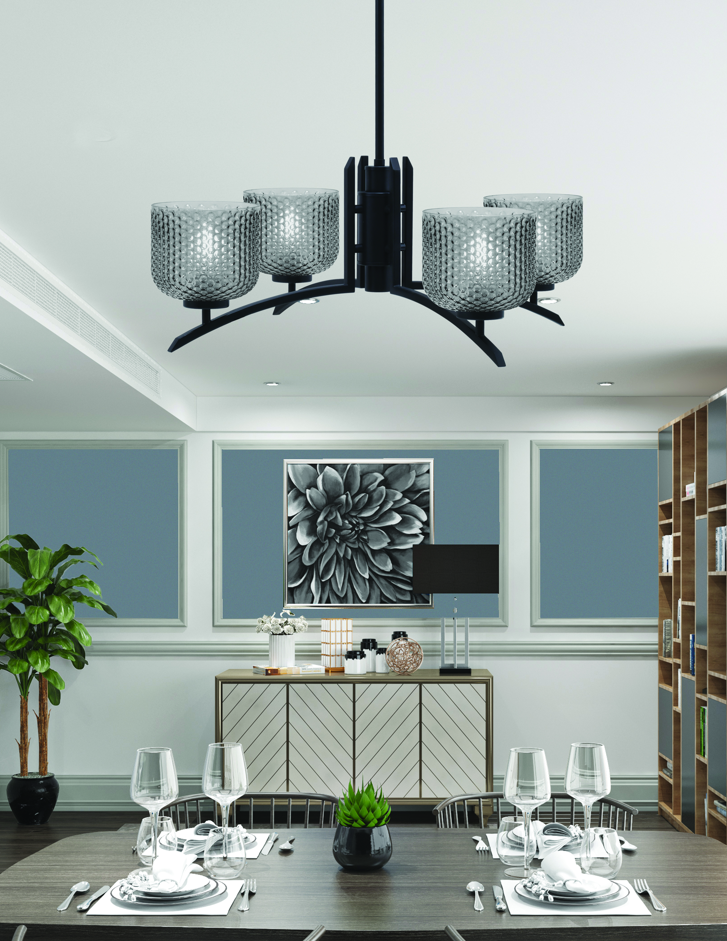 Introducing the Kurve 4 Light Chandelier, Featuring a Stunning Matte Black Finish that Enhances Any Space. This Elegant Chandelier Showcases 6″ Smoke Textured Glass Shades, Creating a Beautiful Play of Light and Shadow. Perfect for Dining Rooms or Living Areas, This Chandelier Adds a Touch of Modern Sophistication to Your Home.