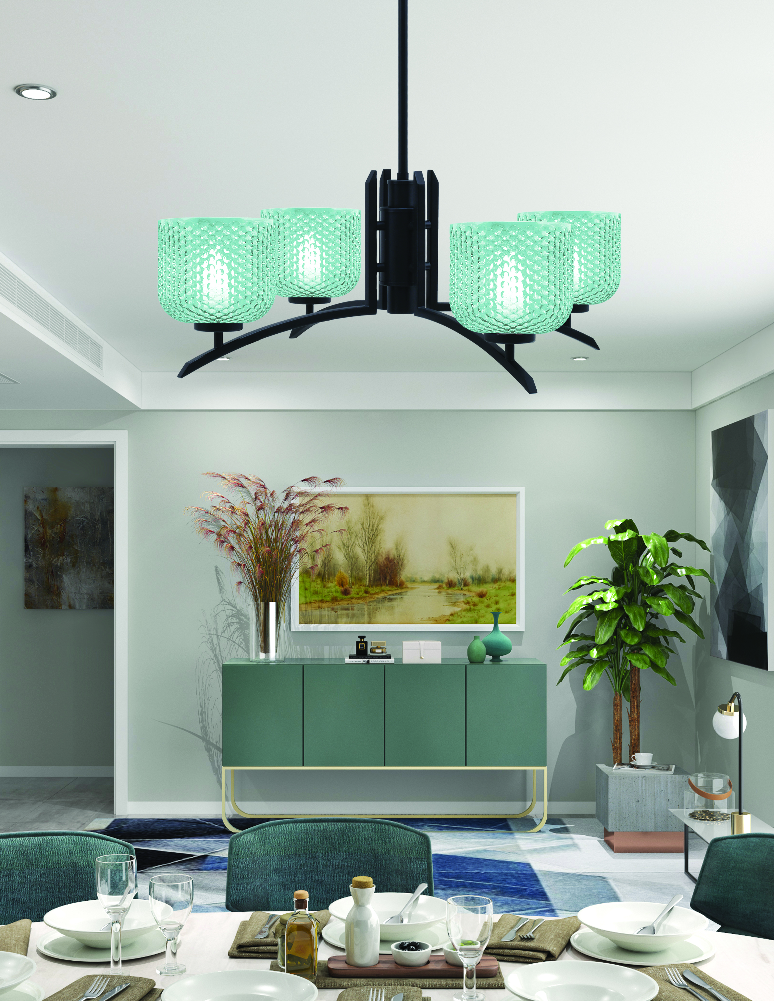 Illuminate Your Space with the Stunning Kurve 4 Light Chandelier. Featuring a Sophisticated Matte Black Finish, This Chandelier Exudes Modern Elegance, Making It the Perfect Focal Point for Any Room. The Beautiful 6″ Turquoise Textured Glass Accents Add a Touch of Vibrant Color and Unique Style, Ensuring Your Home Stands Out.