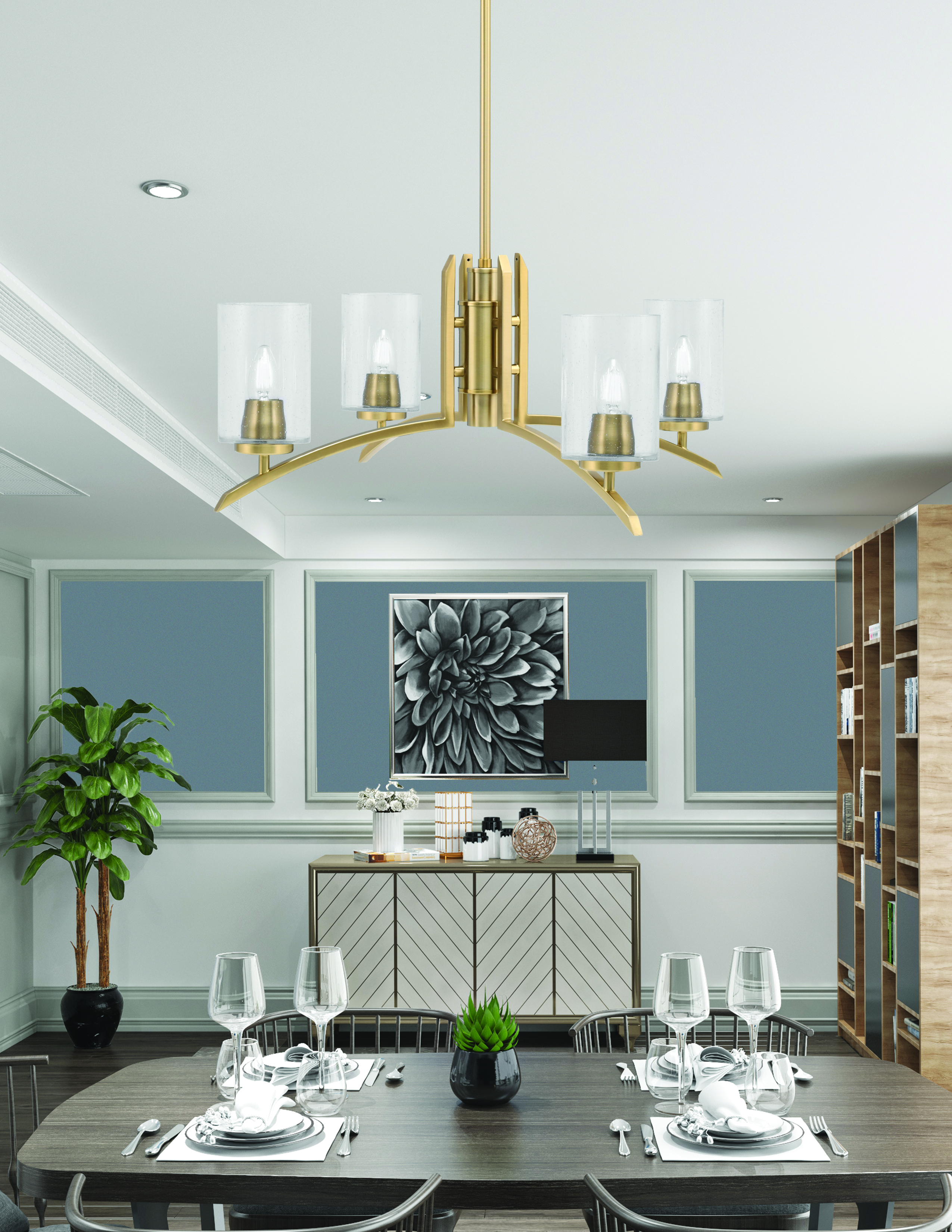 Elevate your home decor with The Kurve 4 Light Chandelier, an exquisite piece that blends contemporary design with elegant charm. This stunning chandelier features a sophisticated New Age Brass Finish that adds a touch of warmth and luxury to any room. The four lights are beautifully complemented by 4″ Clear Bubble Glass shades, which not only diffuse the light softly but also create an enchanting ambiance with their unique textured appearance.