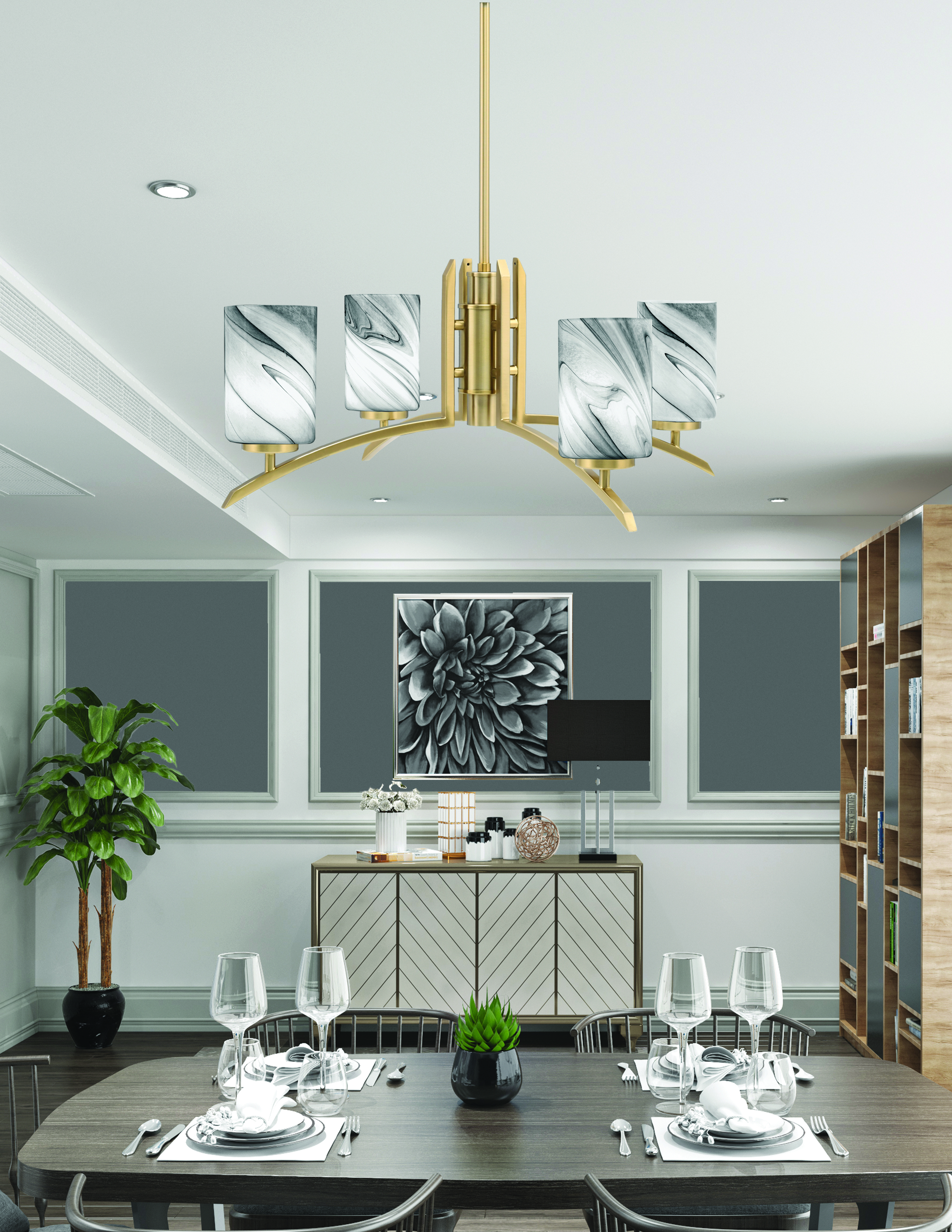 The Toltec Lighting Kurve 4 Light Chandelier in New Age Brass Finish with 4″ Onyx Swirl Glass offers a striking combination of modern design and classic elegance. The New Age Brass finish enhances its sophisticated appeal, while the Onyx Swirl Glass shades add a touch of unique texture and style. This chandelier is designed not only to illuminate your space effectively but also to make a statement with its distinctive aesthetic.