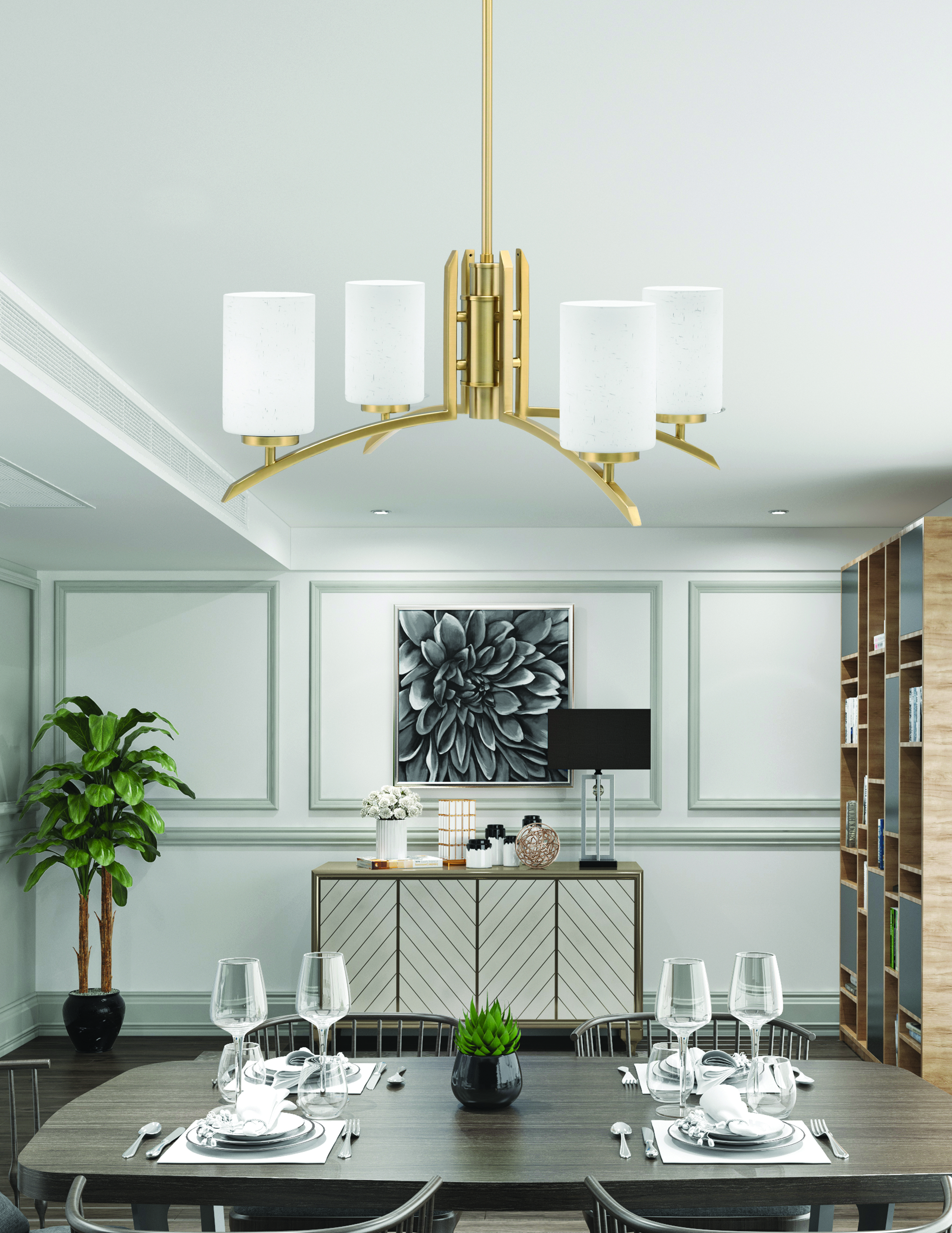 Add a touch of sophistication and elegance to your home with the Toltec Lighting Kurve 4 Light Chandelier. This striking chandelier features a New Age Brass Finish, imparting a warm and luxurious feel to any room. The four lights are adorned with 4″ White Muslin Glass shades, offering a refined and classic look that enhances the overall ambiance.