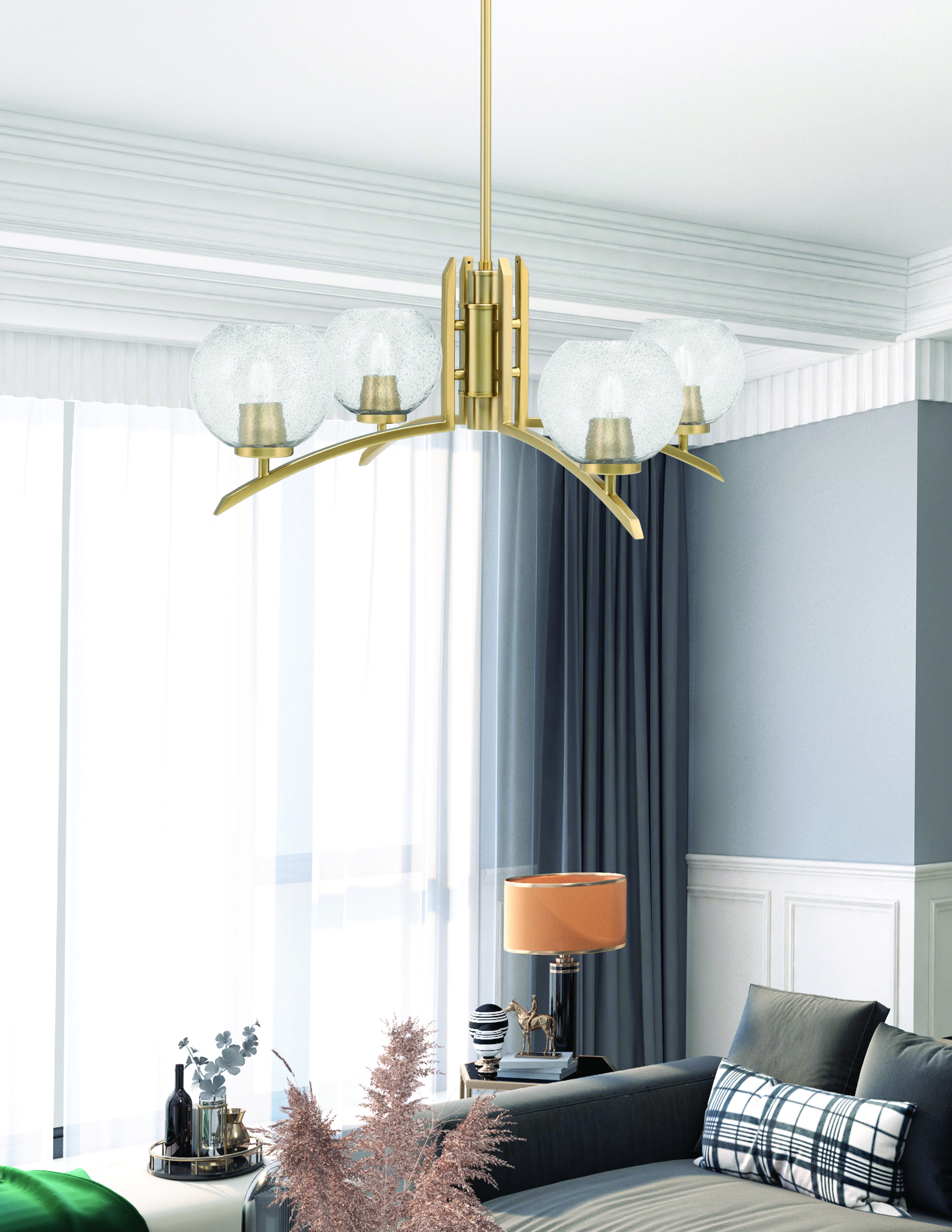 The Toltec Lighting Kurve 4 Light Chandelier in New Age Brass Finish with 5.75″ Smoke Bubble Glass combines modern sophistication with a touch of intrigue. The New Age Brass finish adds a luxurious appeal, complementing the smoky hue and textured surface of the bubble glass shades. This chandelier is designed to provide both stylish illumination and a captivating visual impact, making it an excellent choice for enhancing the ambiance of your space.