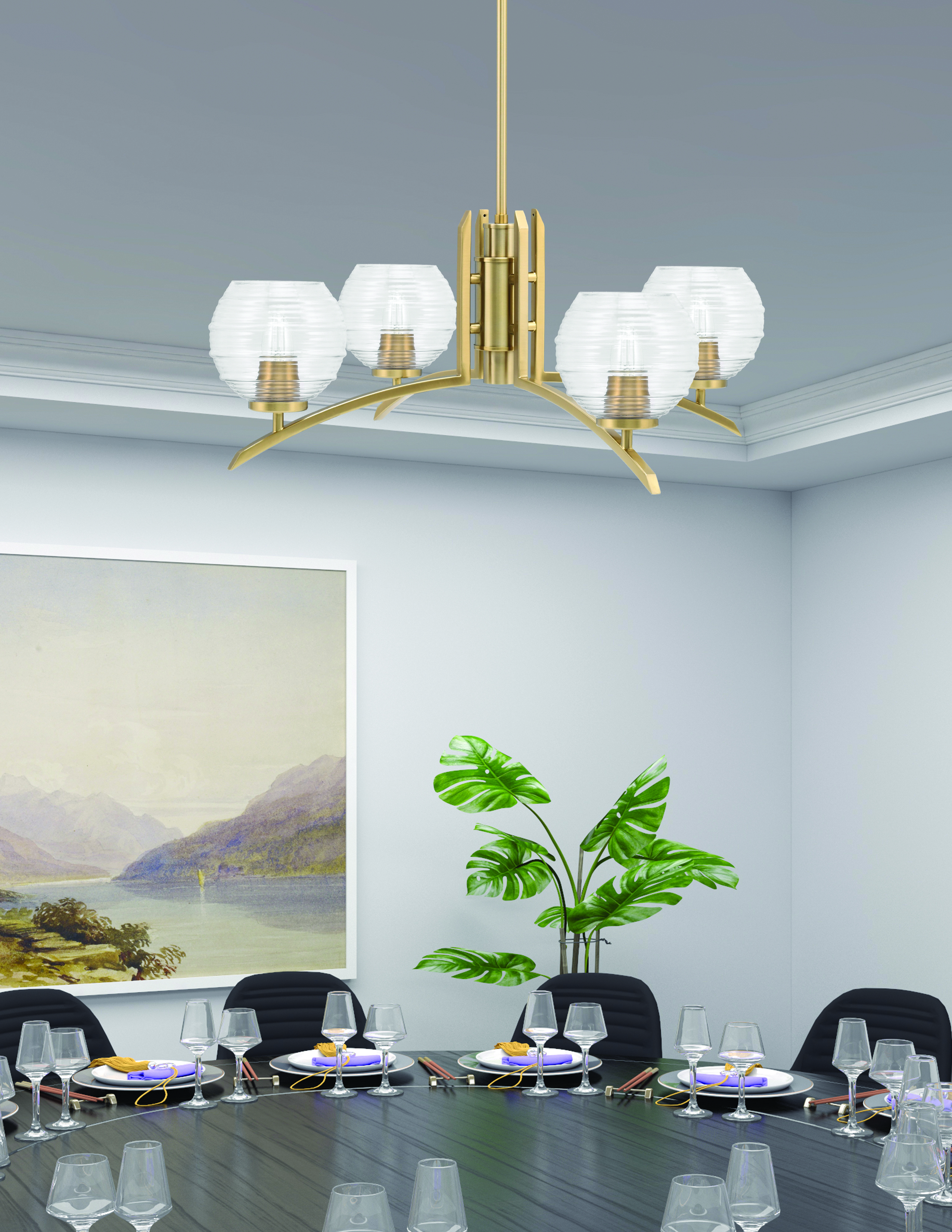 This chandelier features a sleek New Age Brass finish that complements contemporary and transitional interiors. The 4 lights are adorned with 6″ Clear Ribbed Glass shades, adding a touch of texture and diffusing the light beautifully. The design is versatile, making it suitable for dining rooms, living rooms, or entryways where a statement piece is desired.