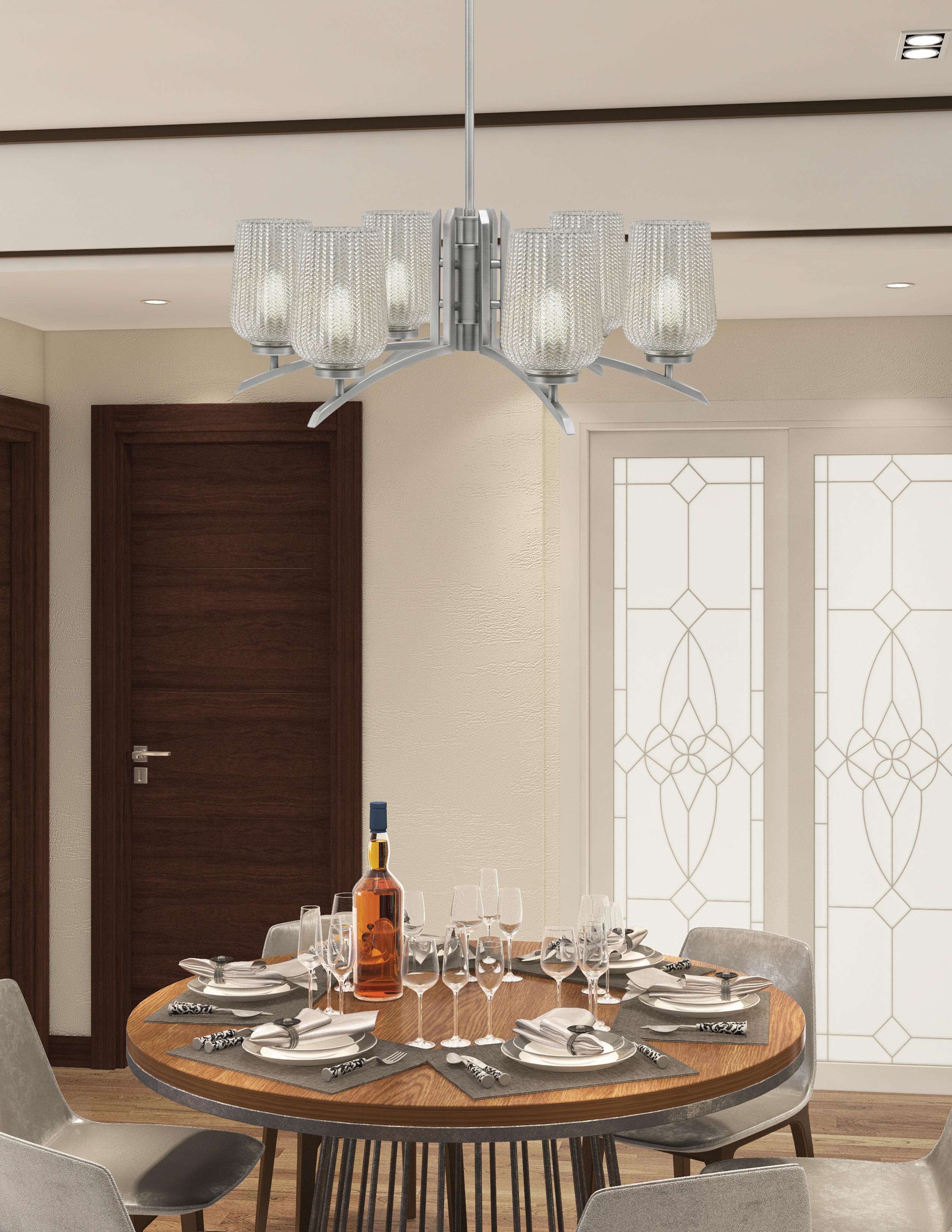 Introducing the Stunning Kurve 6 Light Chandelier, Designed to Elevate Any Space with Its Elegant Presence. Featuring a Striking Graphite Finish, This Chandelier Showcases an Impressive Array of 6″ Silver Textured Glass Shades That Filter Light into a Soft, Inviting Glow. Perfect for Dining Rooms or Living Areas, the Kurve Chandelier Combines Modern Design with Timeless Beauty.