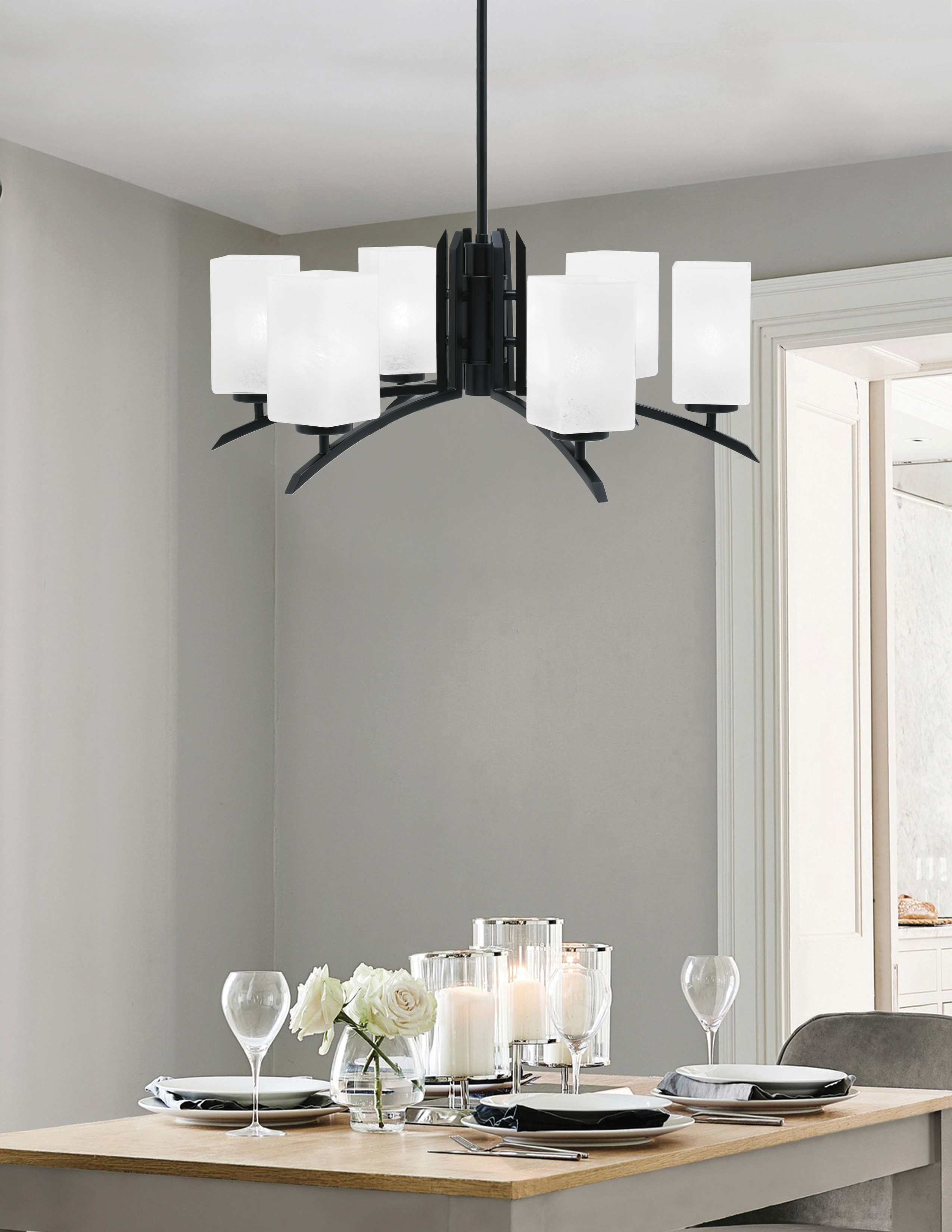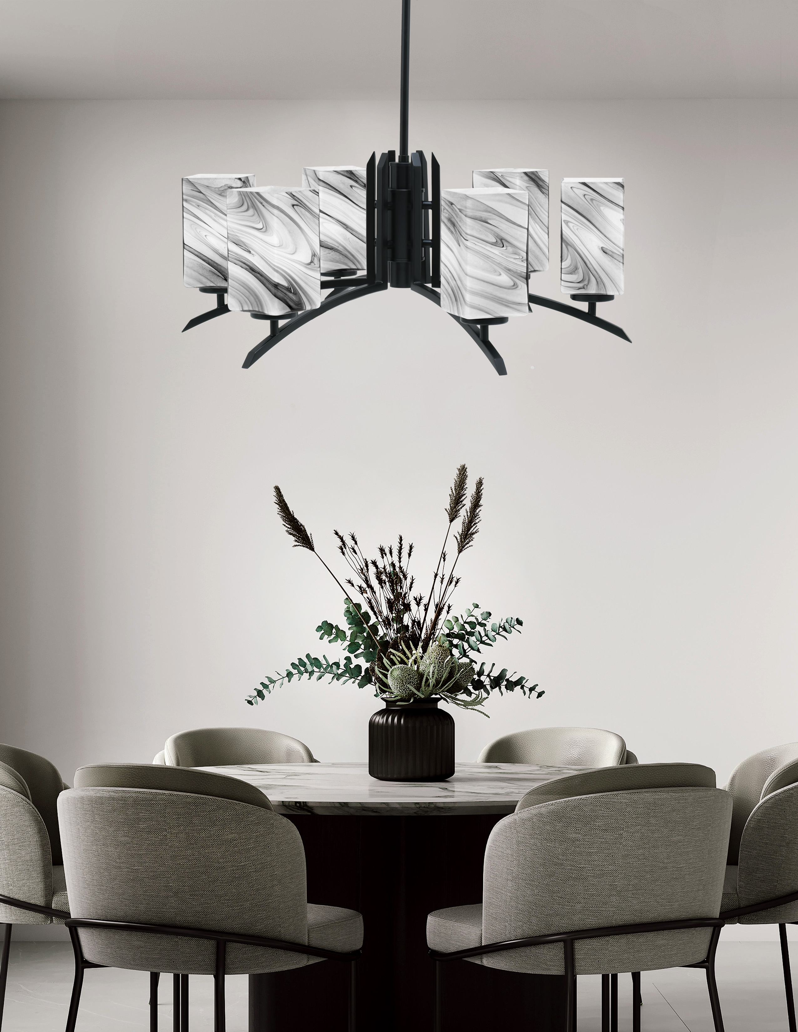 Introducing The Kurve 6 Light Chandelier, A Stunning Addition To Any Contemporary Space. Featuring A Elegant Matte Black Finish And Beautiful 3.5″ Square White Marble Glass, This Chandelier Exudes Style And Sophistication. Illuminate Your Home With Its Brilliant Design, Ensuring A Warm And Inviting Ambiance.
