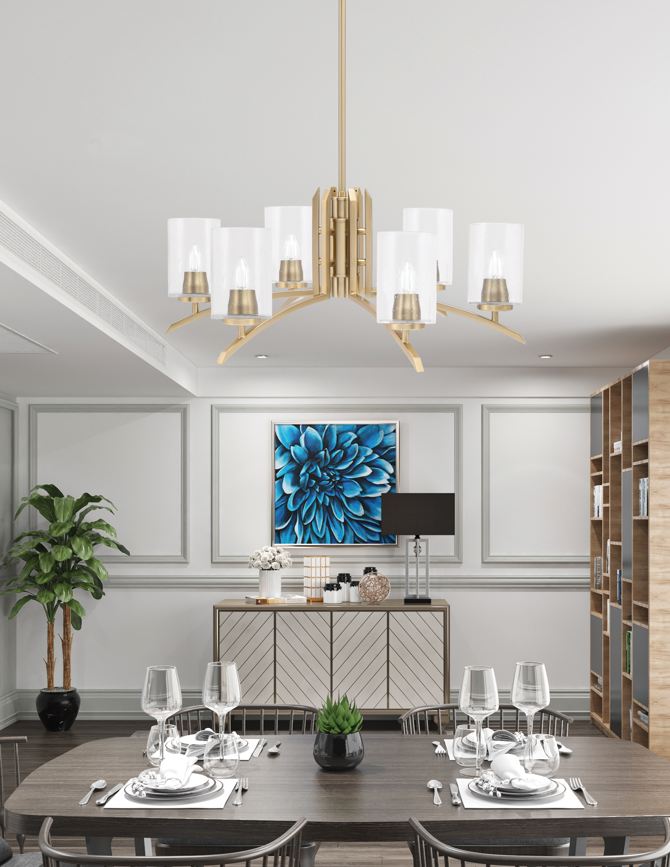 Perfect for dining rooms, living areas, or entryways, this chandelier delivers both functional illumination and a stylish focal point. Its clean lines and balanced design make it a versatile choice for contemporary and transitional interiors. Finished in warm New Age Brass, it features six 4″ Clear Bubble Glass shades that softly diffuse light while adding texture and subtle sparkle.
