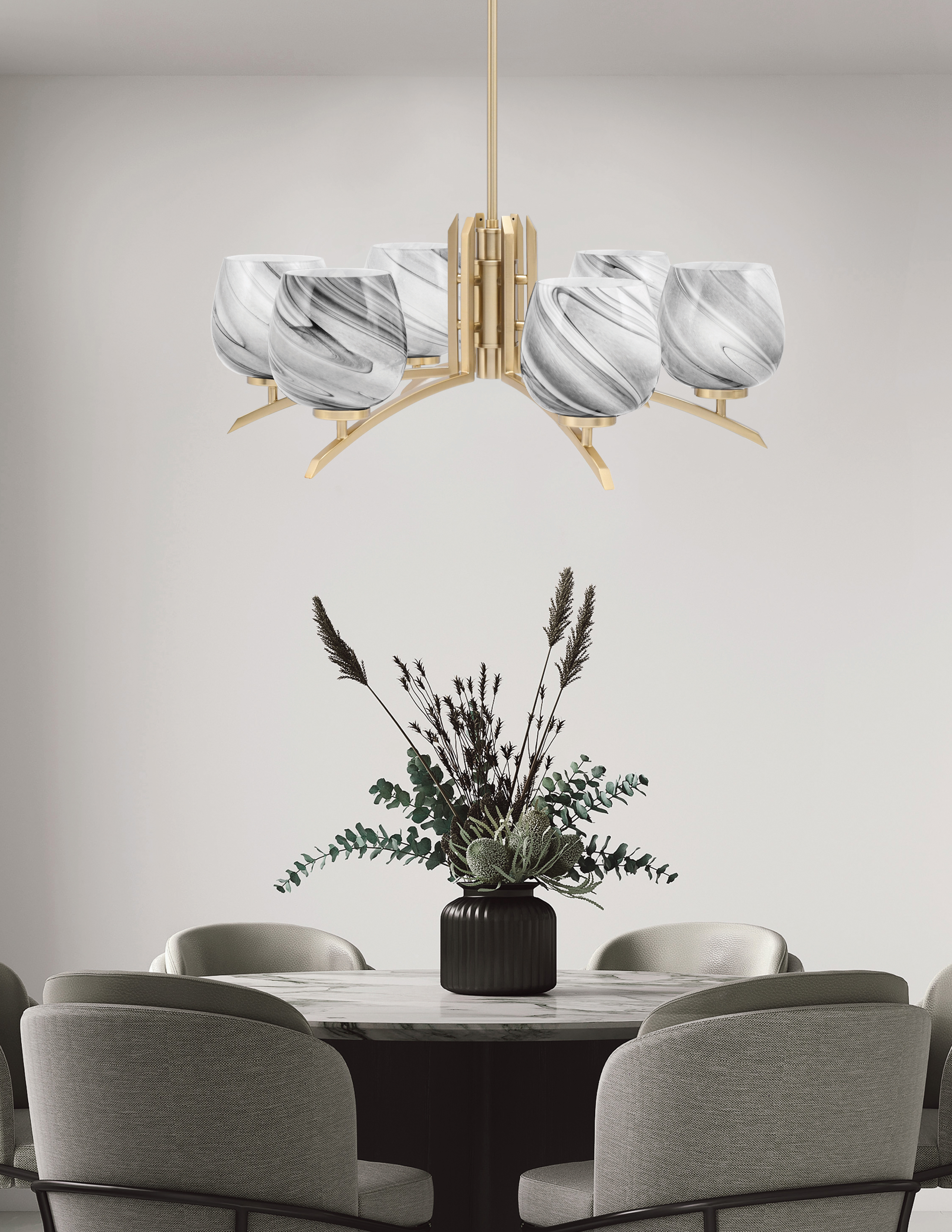 Toltec Lighting 3706-NAB-4819 Kurve 6 Light Chandelier, New Age Brass Finish, 6″ Onyx Swirl Glass
