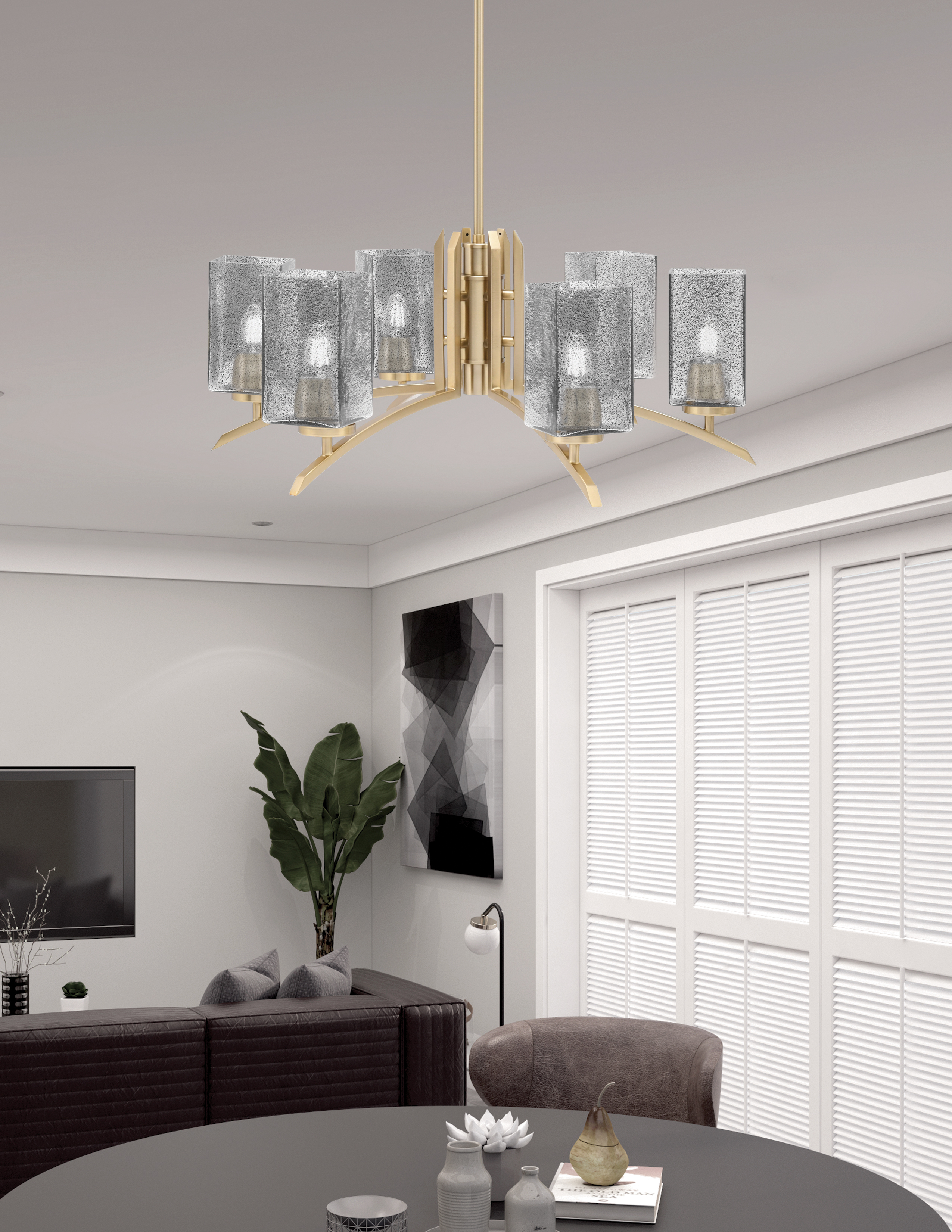 The Toltec Lighting Kurve 6 Light Chandelier with New Age Brass Finish and 3.5″ Square Smoke Bubble Glass is a sophisticated lighting solution that enhances any space. Its blend of modern design, elegant curves, and high-quality materials ensures that it will be a standout piece in your home. Ideal for dining rooms, living rooms, entryways, or bedrooms, this chandelier offers both style and practicality.