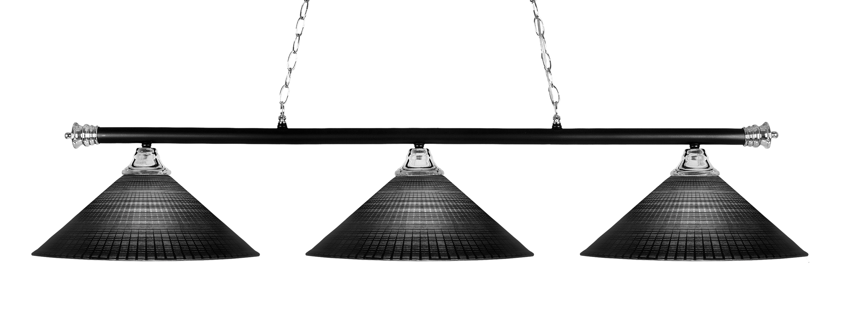 The Oxford 3 Light Bar showcases a striking blend of Chrome and Matte Black finishes for a modern, sophisticated look. Its three 16″ Black Matrix Glass shades add texture and visual depth, diffusing light softly to create an inviting ambiance. Ideal for kitchen islands, dining areas, or bar spaces, this fixture combines bold style with functional illumination