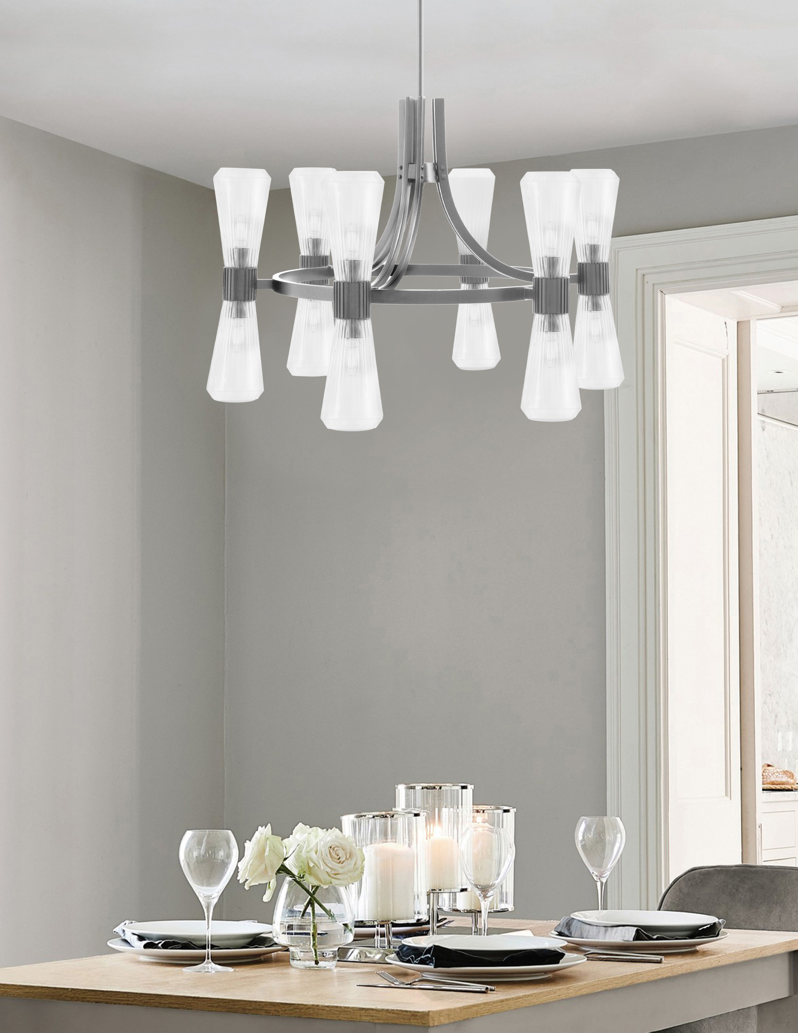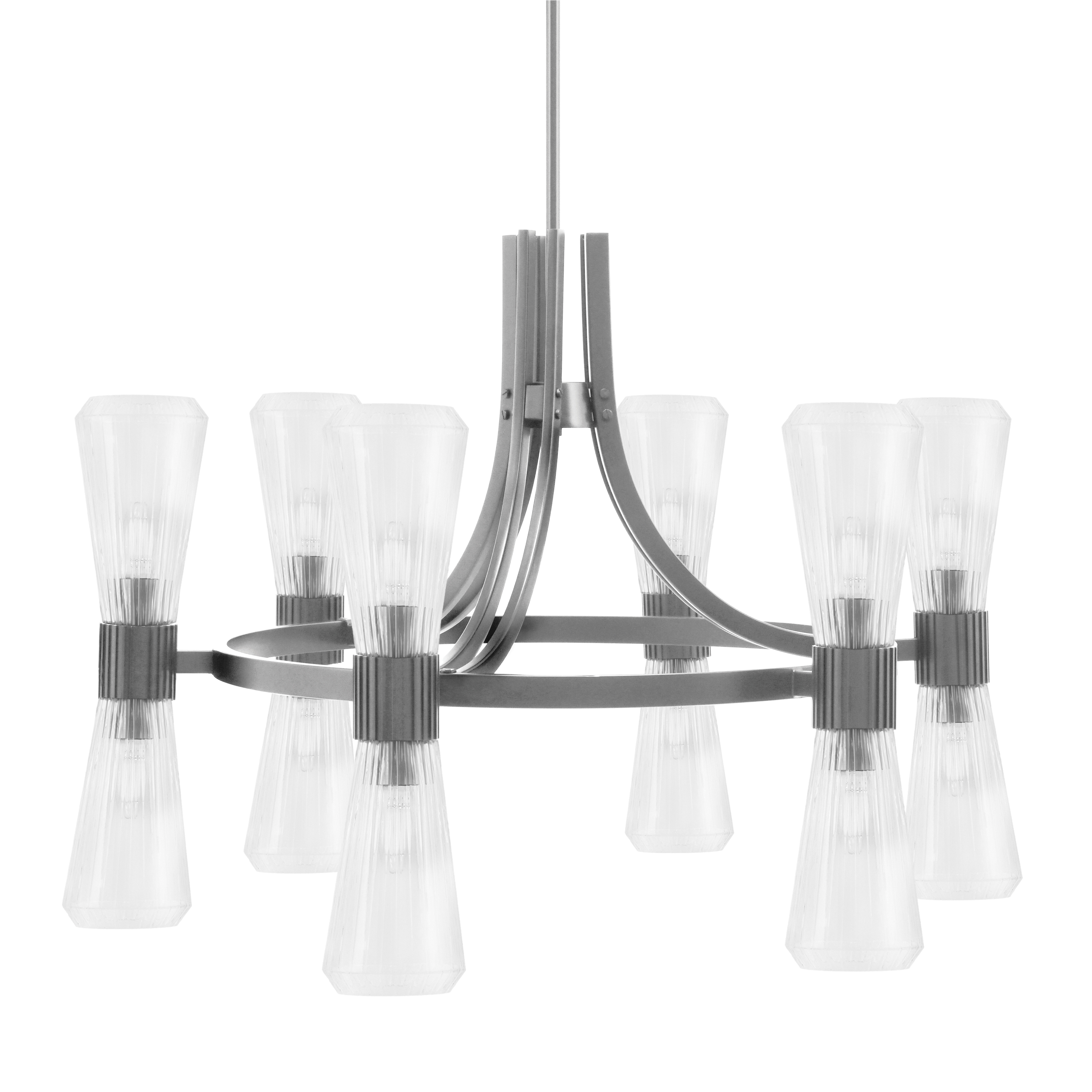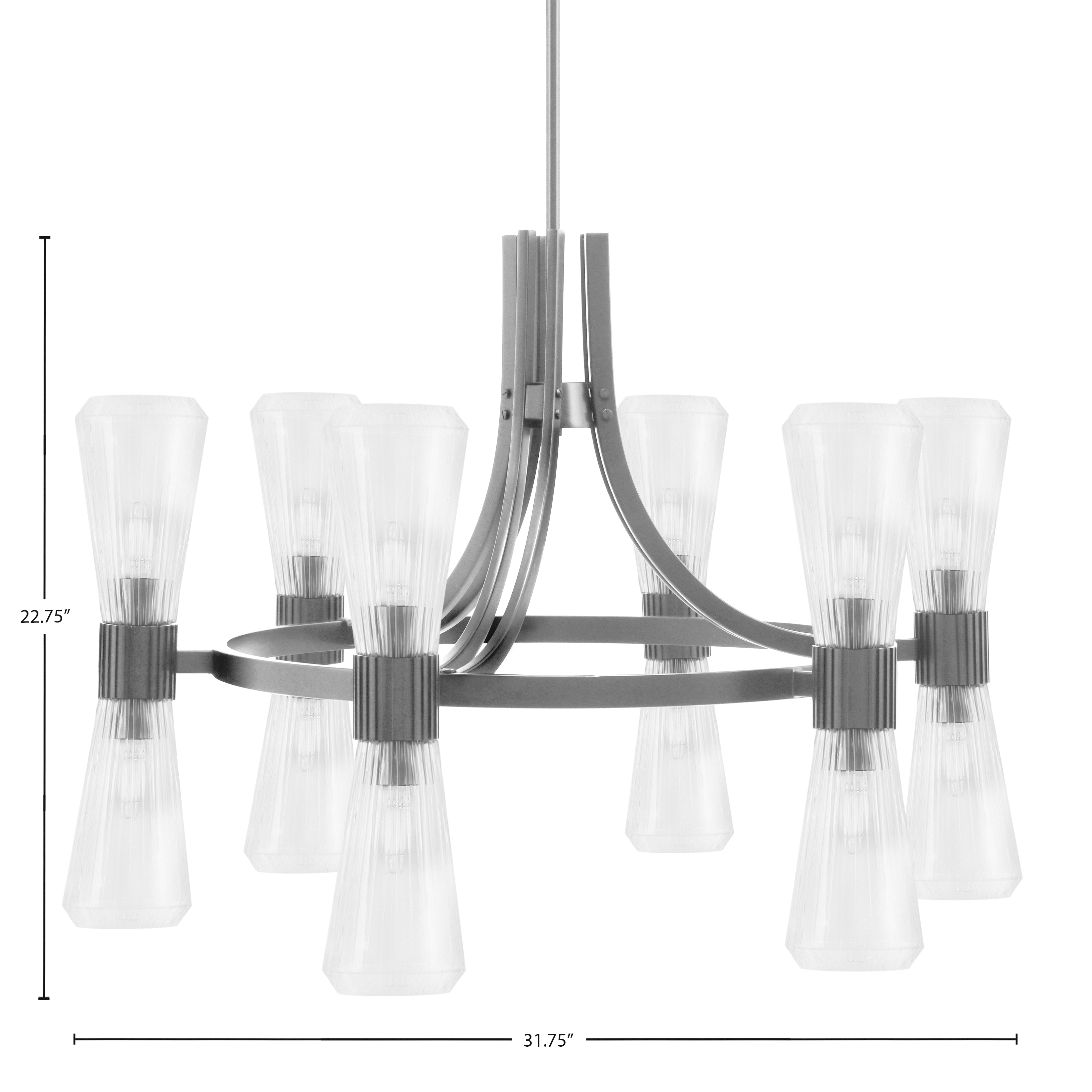 The Everleigh 12 Light Chandelier shown in a Graphite Finish with 4″ Clear Ribbed Glass offers a striking balance of modern structure and classic detailing. The ribbed Glass shades add subtle texture while allowing light to shine through beautifully, creating bright, evenly distributed illumination. With twelve lights arranged in a well-proportioned design, this chandelier makes a sophisticated statement.